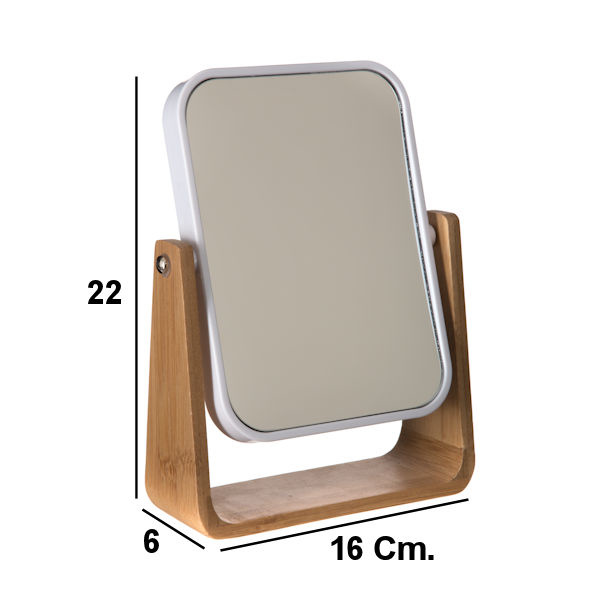 ✅ Staande 360° Draaiende Makeup Spiegel / Scheerspiegel ✅ Bamboe Badkamerspiegel ✅ Spiegel 360 Graden draaibaar ✅ Aan 2 kanten glazen Spiegels ✅ Voorkant Normale Spiegel ✅ Achterzijden 3x Vergrotende Spiegel ✅ Afm. 16 x 6 x 22 Cm ✅ Kleur: Bamboe met Witte rand om de spiegel