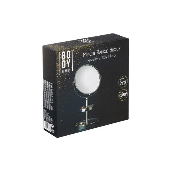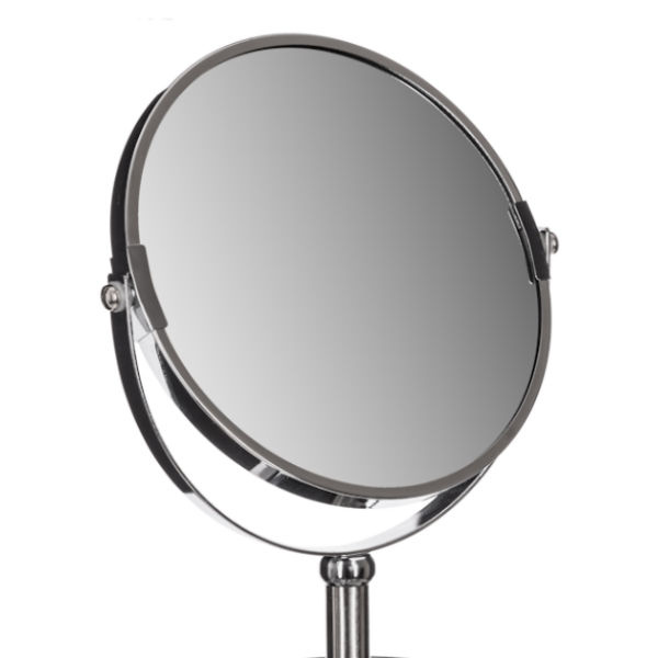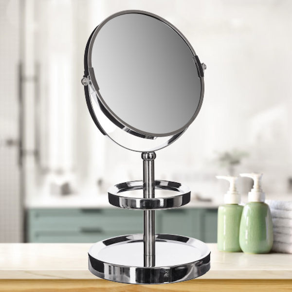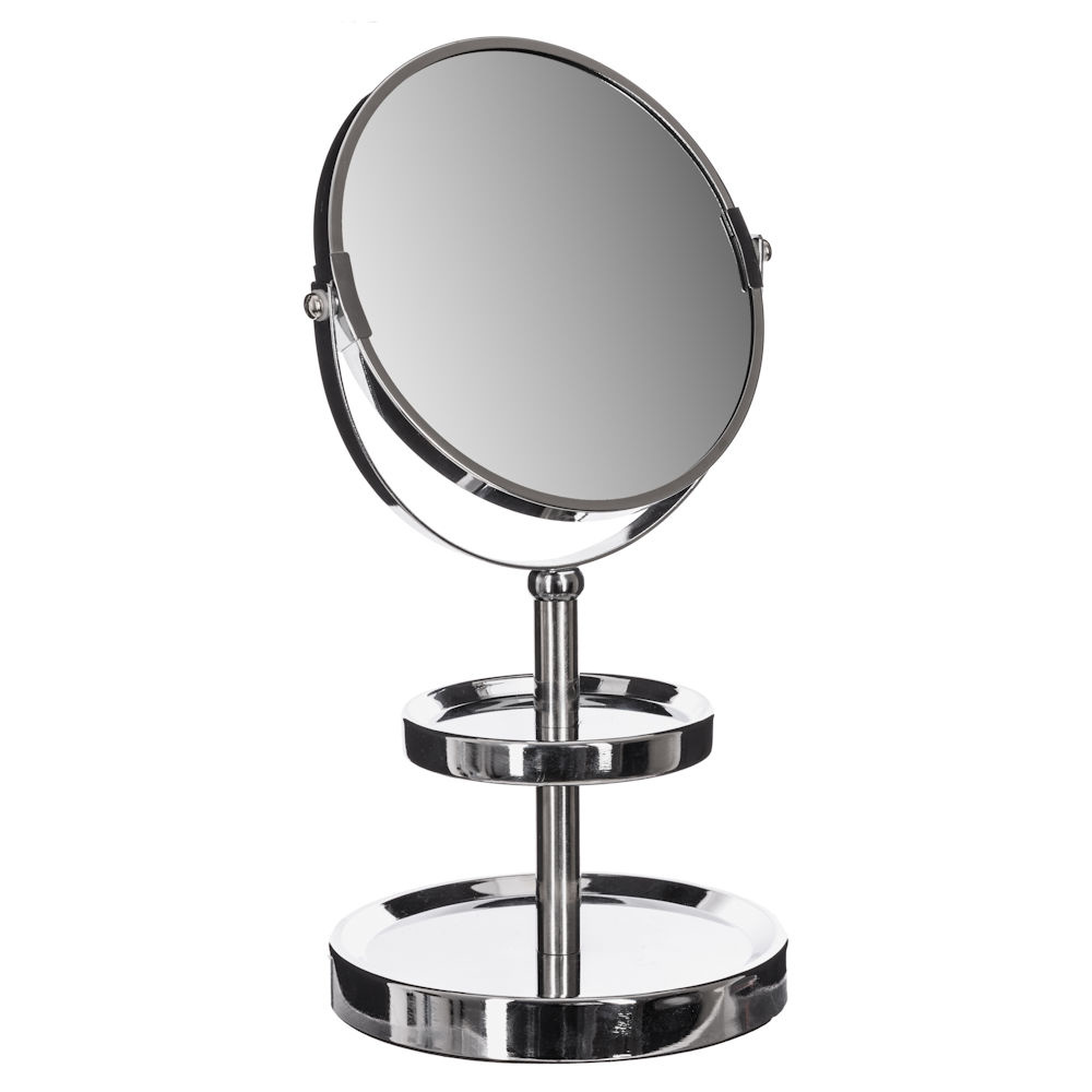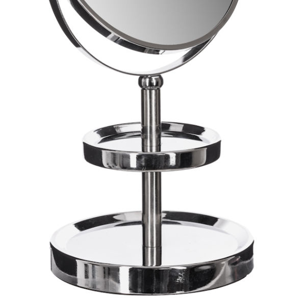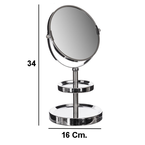 ▶ Een staande Make-up / scheerspiegel, waarvan de spiegels 360 graden draaibaar zijn. Tevens heeft deze staande spiegel, 2 plateaus voor de opslag van make-up, sieraden etc. De spiegel heeft aan 1 kant een gewone normale glazen spiegel en aan de andere kant een x3 vergrootspiegel.