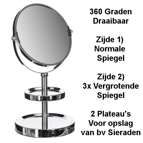 ✅ Staande Makeup Spiegel / Scheerspiegel ✅ Badkamerspiegel ✅ Spiegel 360 Graden draaibaar ✅ Aan 2 kanten glazen Spiegels ✅ Voorkant Normale Spiegel ✅ Achterzijden 3x Vergrotende Spiegel ✅ Met 2 handige plateaus voor sieraden make up etc ✅ Afm. 16 x 16 x 34 Cm ✅ Kleur: Chrome