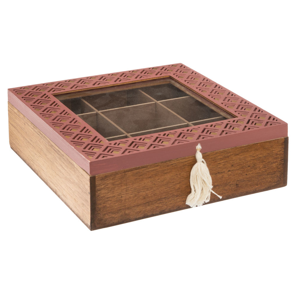 Je Thee berg je vanaf nu makkelijk en overzichtelijk op in deze stijlvolle terracotta theedoos. Onder het venster zie je 9 handige opbergvakjes waarin je verschillende theezakjes kwijt kan.