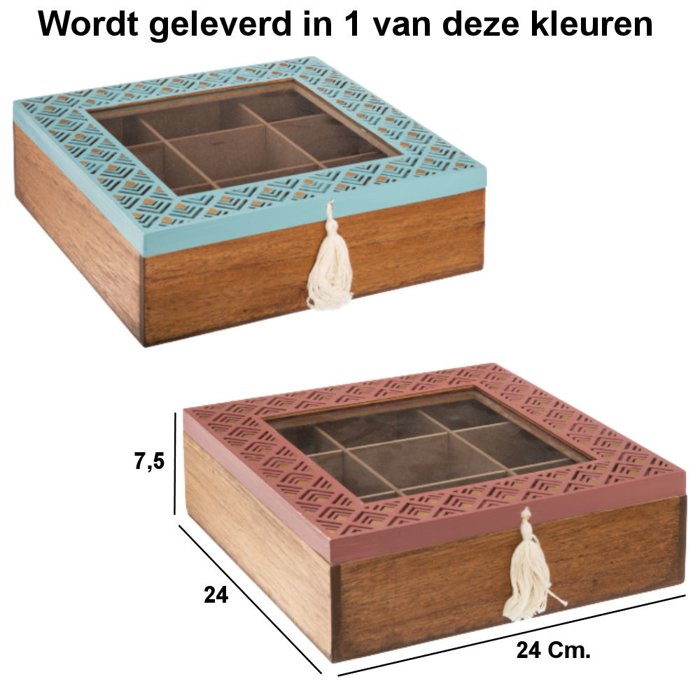 Decopatent Decopatent® Theedoos 9 vaks - Terracotta Design theedoos met doorzichtig venster - Mdf Hout - 9 vakken theekist - Blauw OF Roze