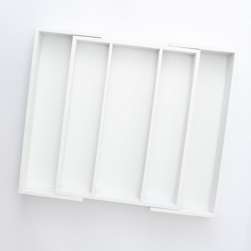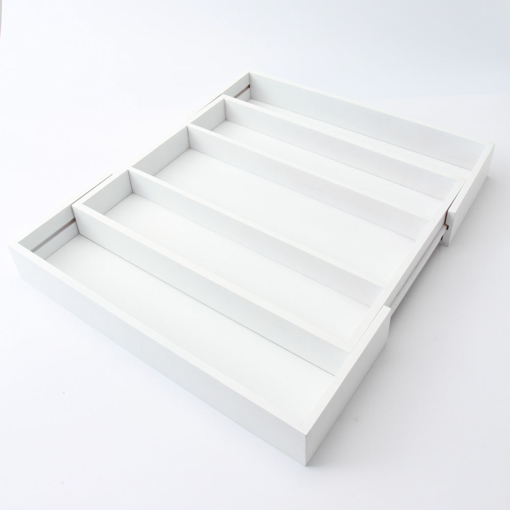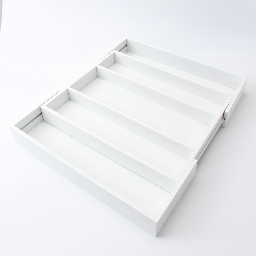 De bestekbak is eenvoudig uitschuifbaar. Zo pas je hem aan je wensen aan. Door de bestekbak uit te schuiven creëer je aan beide zijdes een vak extra. Als je de zijkanten uitschuift heb je bestekbak met 5 vakken. Genoeg ruimte voor al je bestek!