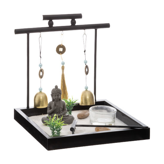 Deze complete relax set, bestaat uit: een vierkant plateau, zand, stenen, Oosterse Gong bellen, waxinehouder, en een Buddha beeld.