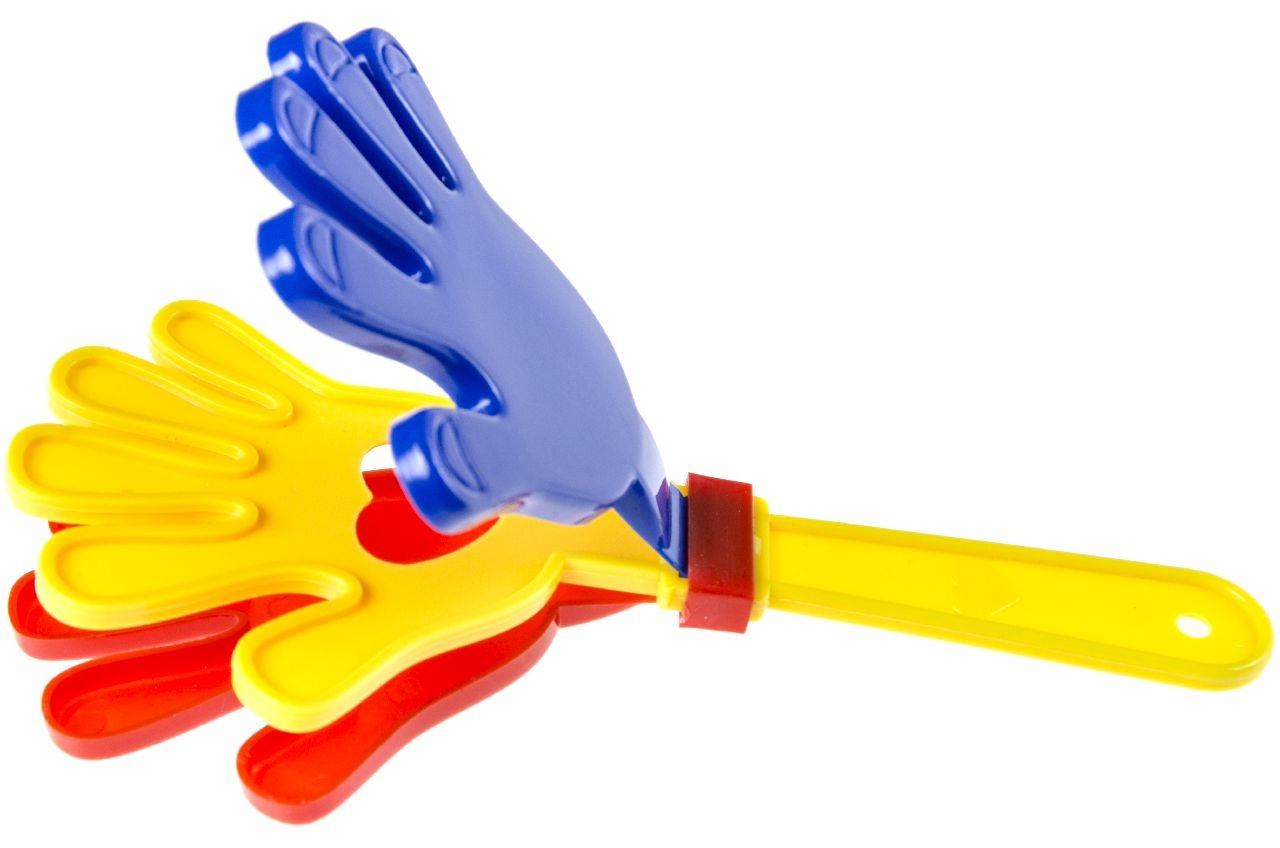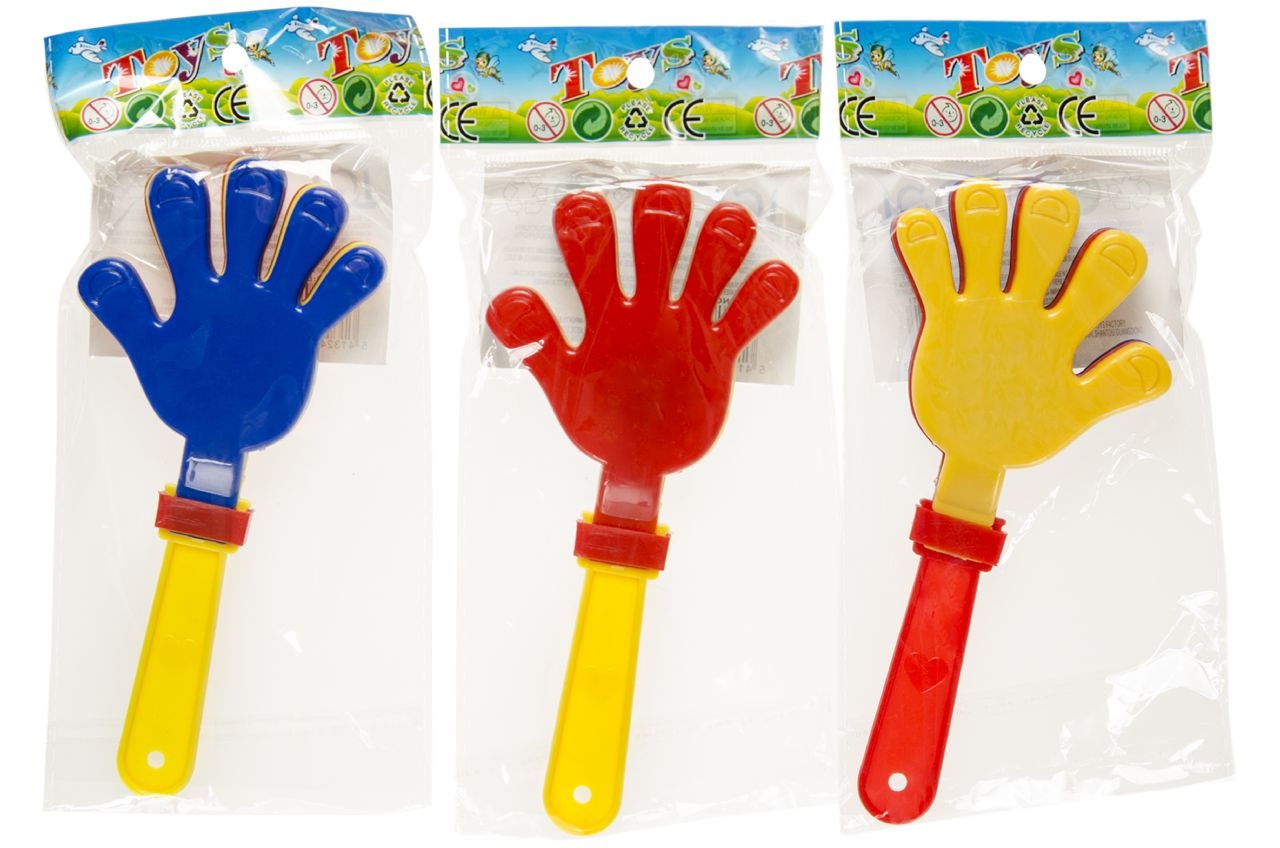 Het klaphandje groot is een vrolijk geluidsspeeltje dat gegarandeerd de aandacht trekt. Met een simpele beweging heen en weer zorgt dit handvormige speeltje voor een luid klappend geluid. Ideaal voor feestjes, sportwedstrijden of als vrolijk uitdeelcadeautje. Het klaphandje is gemaakt van stevig kunststof en ligt prettig in de hand dankzij het lange handvat. Door het lichte gewicht is het eenvoudig te gebruiken door kinderen. Het handje bestaat uit drie lagen die tegen elkaar slaan bij beweging, wat zorgt voor het kenmerkende klapgeluid. Dit maakt het klaphandje niet alleen leuk om mee te spelen, maar ook perfect om aan te moedigen tijdens evenementen of optredens. De felle kleuren zorgen voor extra visuele aantrekkingskracht en maken het handje een opvallende toevoeging aan elk feestpakket of traktatiezakje. Het klaphandje groot is een klassiek en tijdloos speeltje dat kinderen blijft aanspreken door het eenvoudige maar effectieve ontwerp.Verschillende uitvoeringen/kleuren worden door elkaar geleverd.