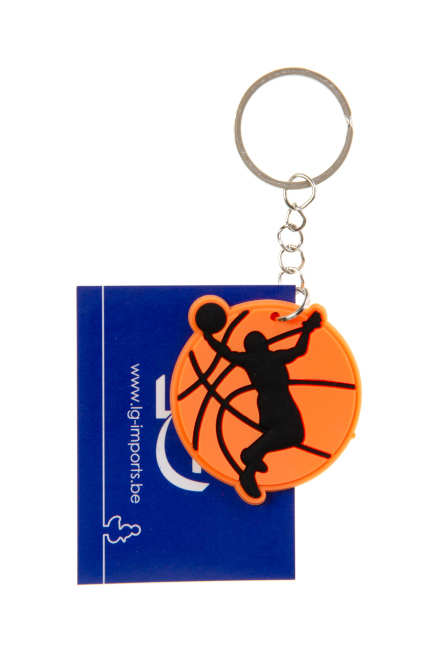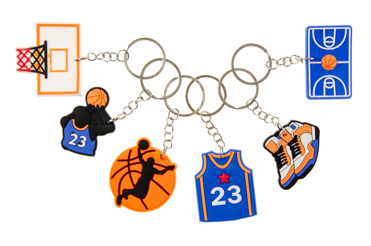 Deze stoere sleutelhanger in basketbalthema is een sportieve toevoeging aan elke sleutelbos of tas. De hanger is gemaakt van flexibel pvc en heeft een vrolijk ontwerp met diverse basketbalillustraties zoals een basketbalveld, een speler, een basket, een shirt met nummer 23, schoenen en een bal. Door het zachte materiaal is de sleutelhanger licht van gewicht en prettig in gebruik. Ideaal om uit te delen tijdens sportdagen, traktaties of als klein prijsje bij een basketbaltoernooi. De sportieve vormgeving spreekt vooral jonge basketbalfans aan en zorgt voor herkenning en plezier. Dankzij het stevige metalen ringetje is de hanger makkelijk te bevestigen aan sleutels, rugzakken of etuis. Leuk als klein cadeautje voor sportliefhebbers of als motiverend presentje na een goede sportprestatie.Verschillende uitvoeringen/kleuren worden door elkaar geleverd.