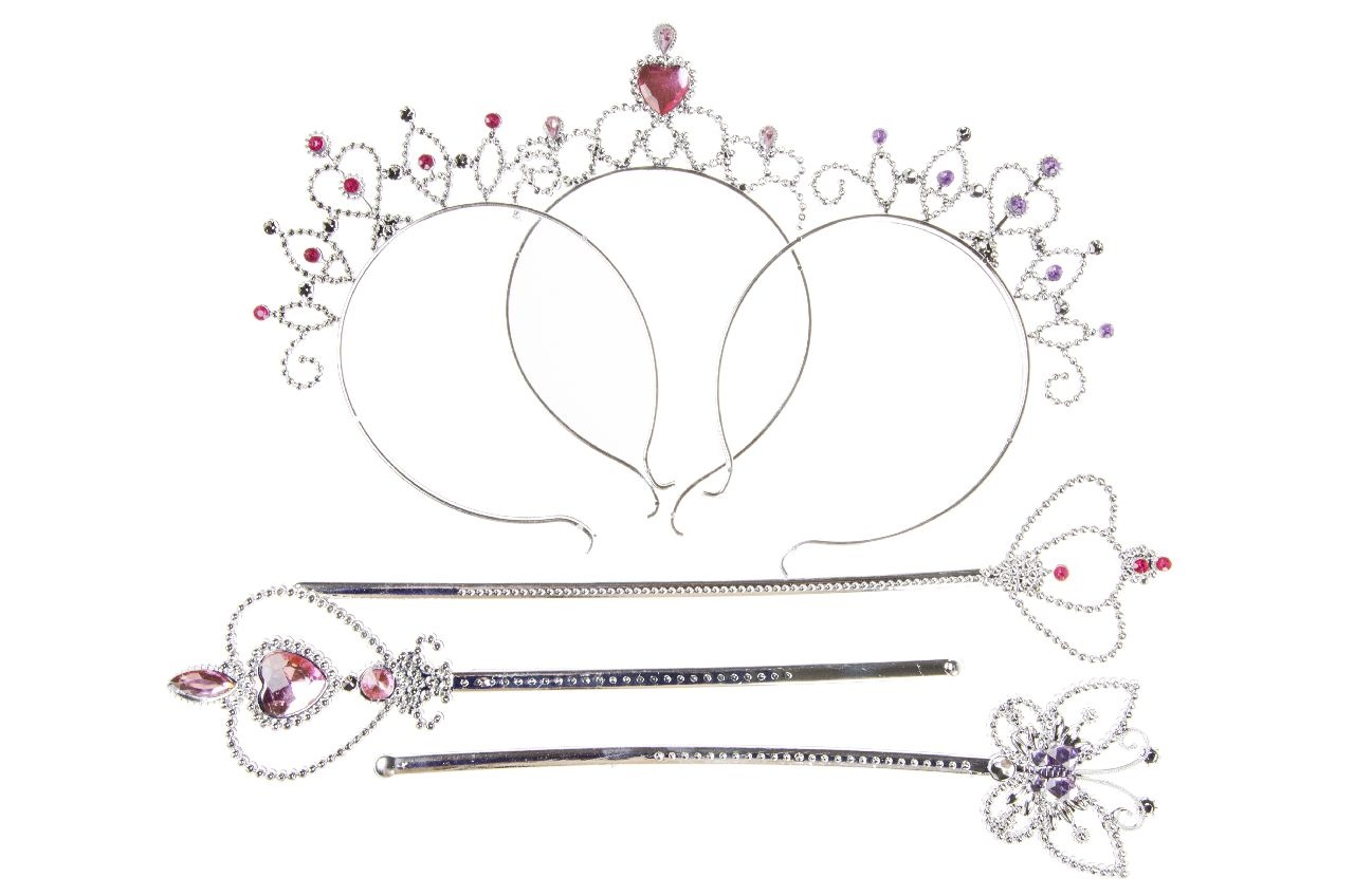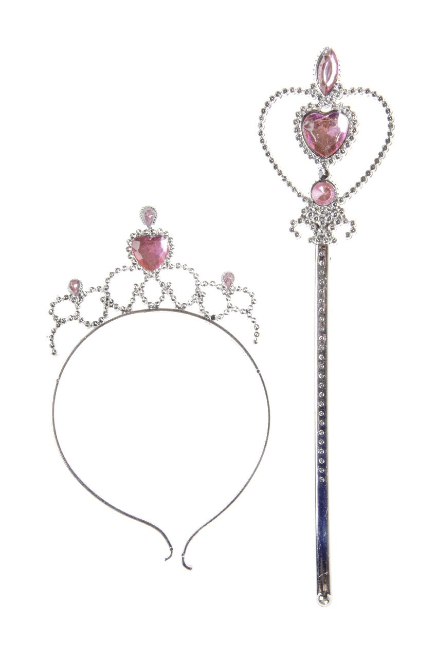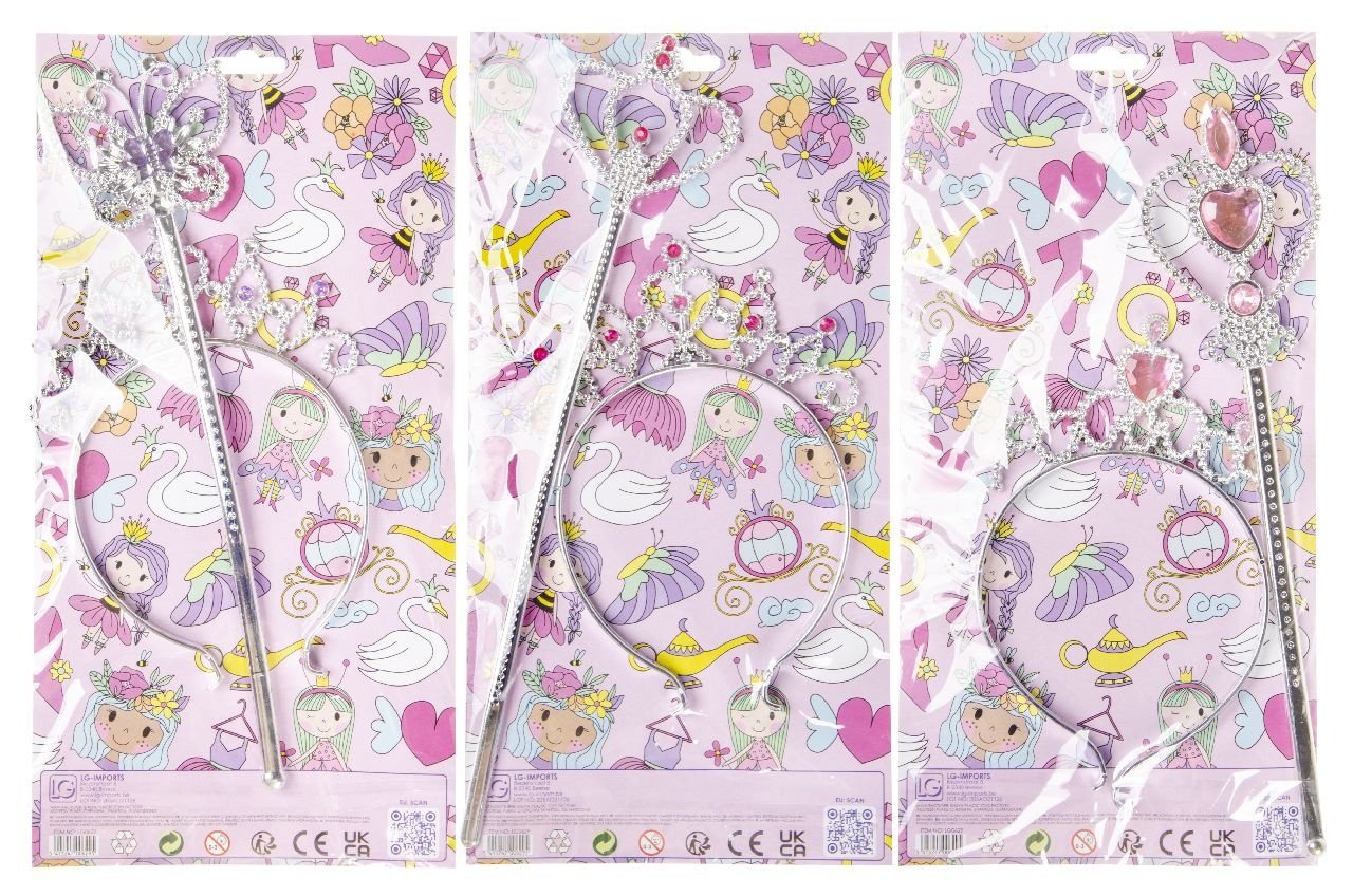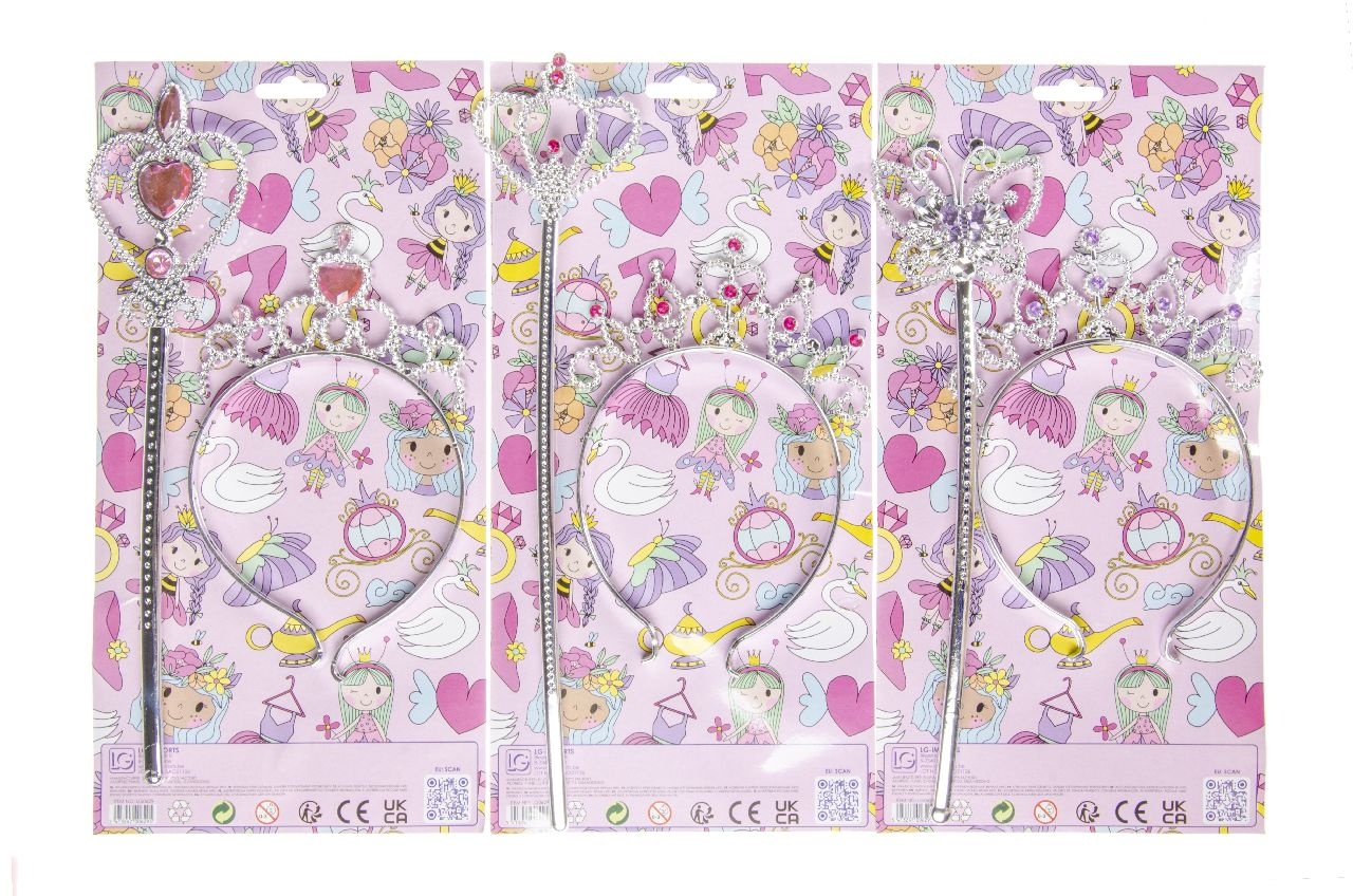 Deze betoverende tiara met toverstaf is het perfecte accessoire voor elk prinsessenfeest of verkleedpartijtje. De set bestaat uit een glinsterende tiara en een bijpassende toverstaf, beide versierd met glimmende steentjes, sierlijke vormen en fonkelende details. Dankzij de lichte materialen en comfortabele pasvorm is de tiara ideaal voor langdurig dragen door jonge kinderen. De toverstaf is voorzien van een sierlijke bovenkant in de vorm van een hartje, kroon of vlinder, wat zorgt voor een magisch effect tijdens het spelen. De feestelijke achtergrond op de verpakking met feeën en bloemen maakt deze set extra aantrekkelijk om cadeau te geven of uit te delen. Of het nu gaat om een kinderfeestje, carnaval of verkleedkist, deze prinsessenset zorgt gegarandeerd voor uren speelplezier. Een leuke verrassing voor elke kleine prinses in spé.Verschillende uitvoeringen/kleuren worden door elkaar geleverd.