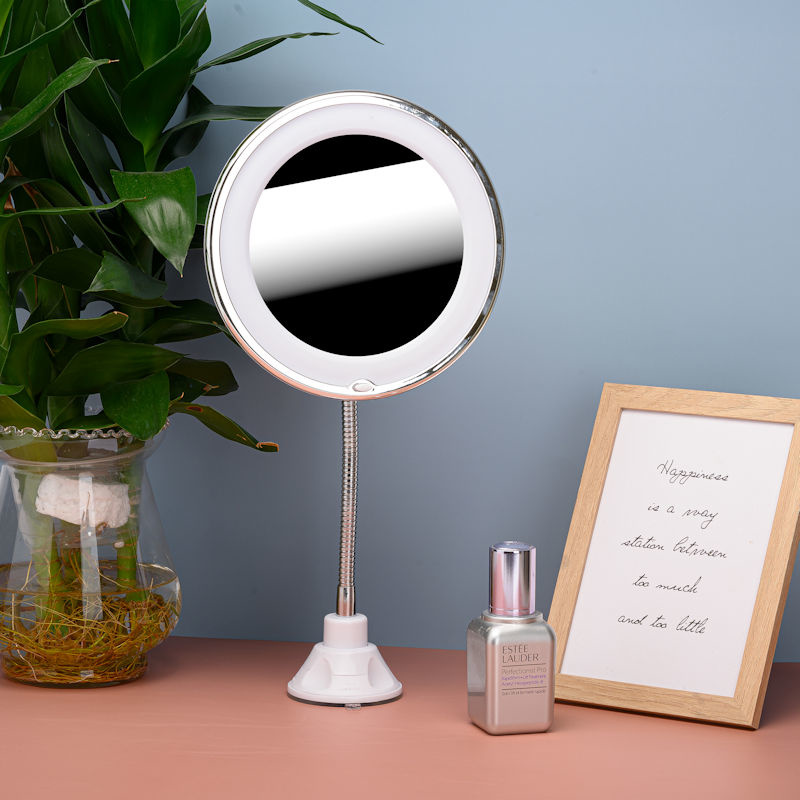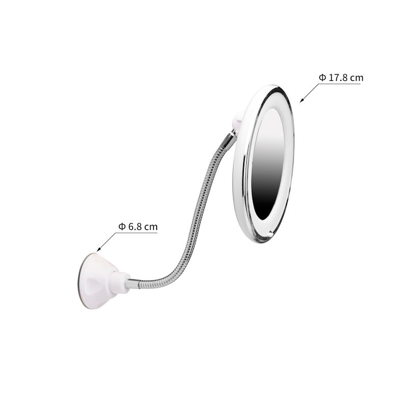 Dankzij het grote spiegeloppervlak die de reflectie tot maar liefst 10x vergroot en voorzien is van LED verlichting. De make-up cosmeticaspiegel staat stevig op een stabiele voet met zuignap. Welke je dus eenvoudig vast kan zetten op tafel of aan de muur.