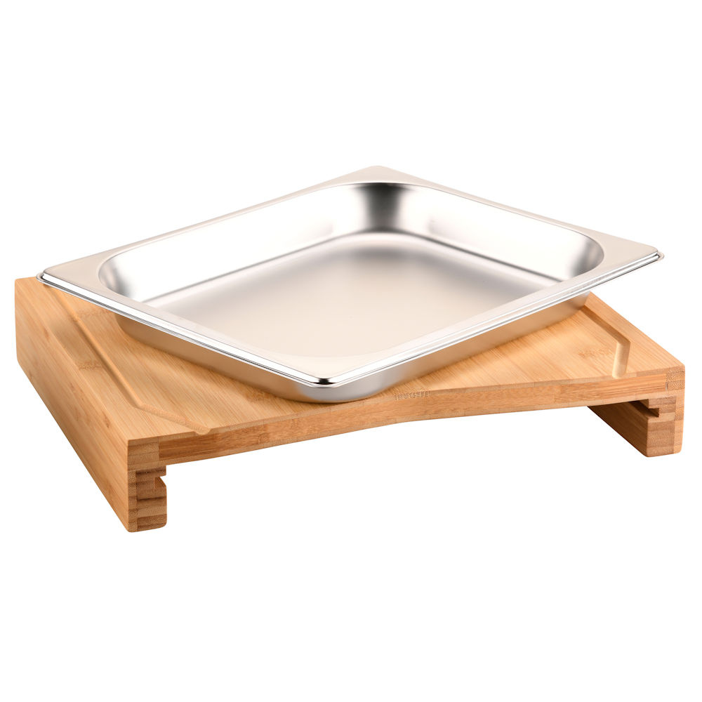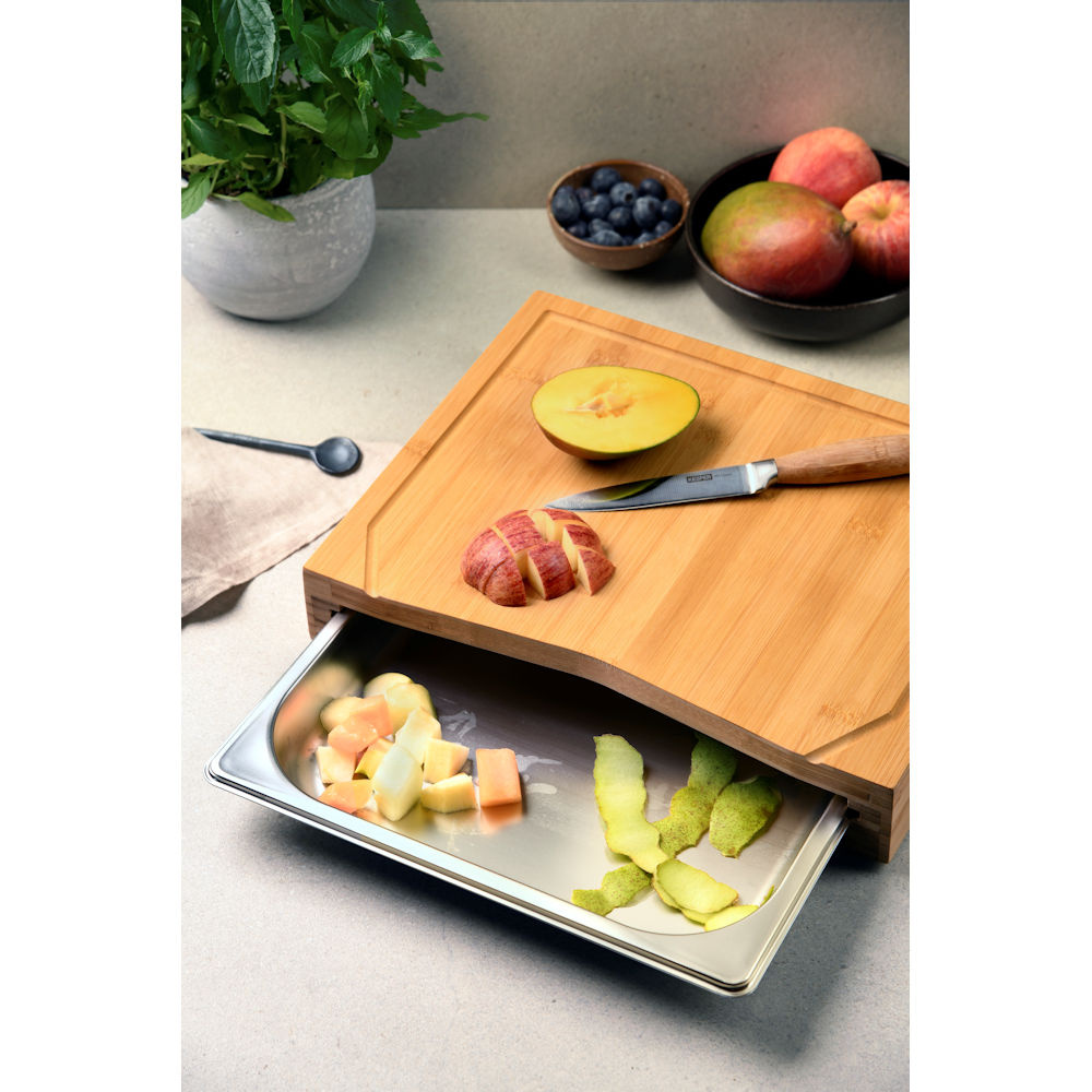 Verhoogde 2-1 FSC® Bamboe Snijplank met 1 uitschuifbare RVS opvang bakken / Opvang container aan de voorzijde.