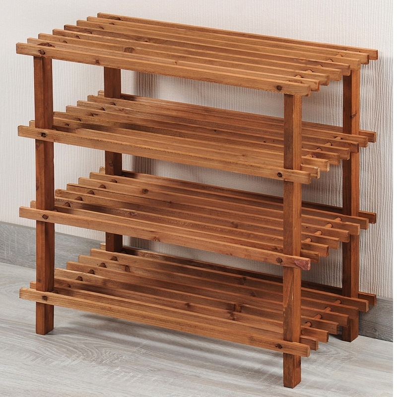 FSC® Dennenhouten Schoenenrek, 4 Verdiepingen hoog voor 12 Paar Schoenen. Kleur: Donker Dennenbruin. Afmetingen: 54 x 26 x 52 Cm.
