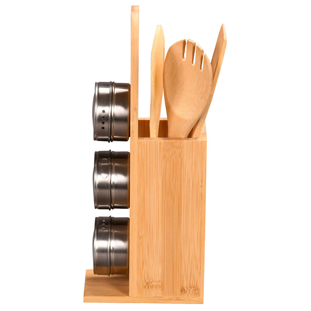 7-Delige FSC® Keukengerei houder Set, Inclusief 3x spatels en 3x Ronde Kruidenpotjes. Keuken organizer van FSC® Bamboe hout.