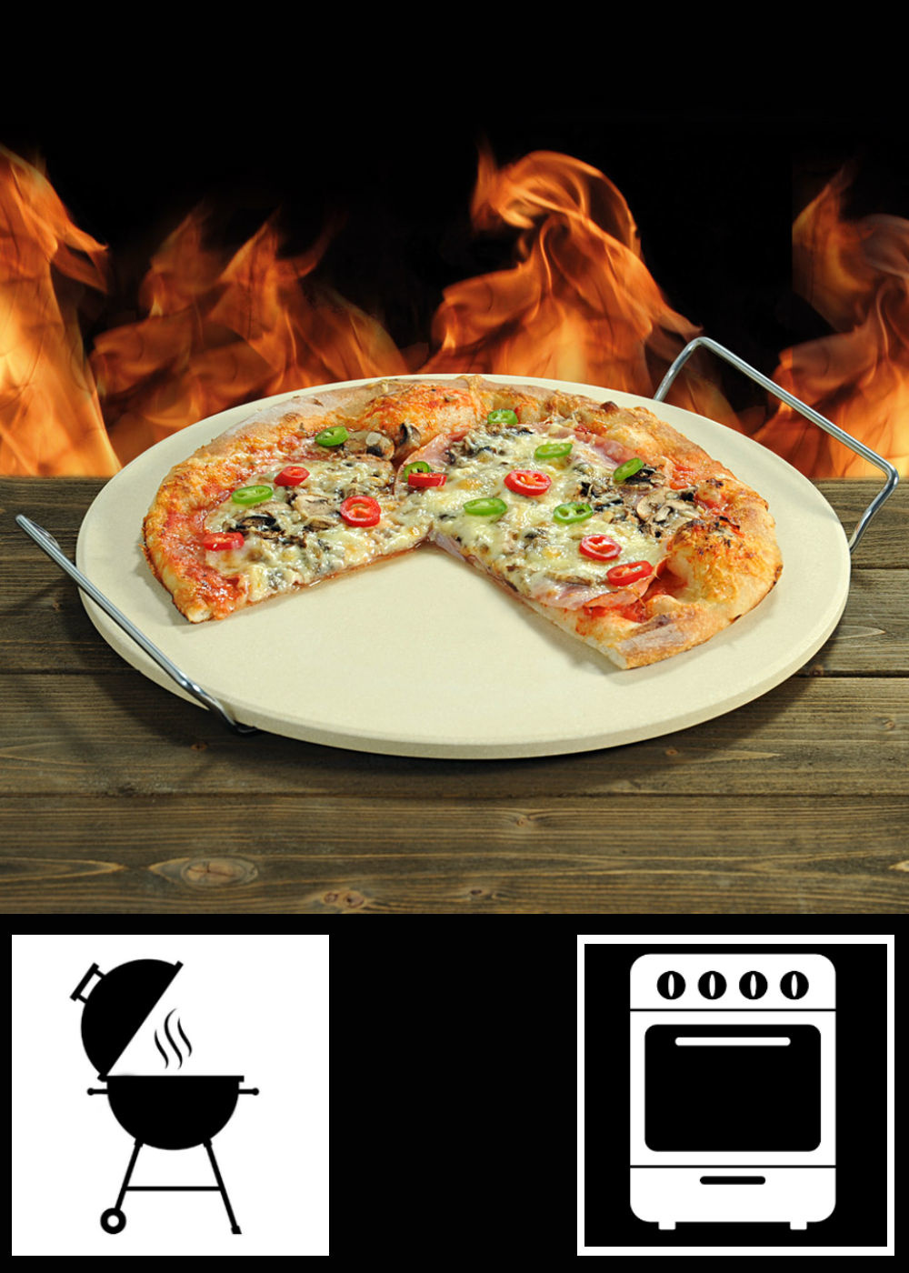 Iedereen weet dat je de lekkerste pizza's in Italië eet. Maar vanaf nu kun je deze heerlijke pizza's zelf maken op deze pizzasteen. Met deze grillmeister pizzasteen van natuursteen (Cordieriet) bereid je de beste en lekkerste pizza's nu gewoon zelf in een dichte barbecue of in jouw oven. Eerst warm je deze pizza steen op in de oven of op de barbecue, tot een zeer hoge temperatuur. Om zo de lekkerste pizza's te bereiden. Wordt geleverd met verchroomde houder voorzien van handvat.
