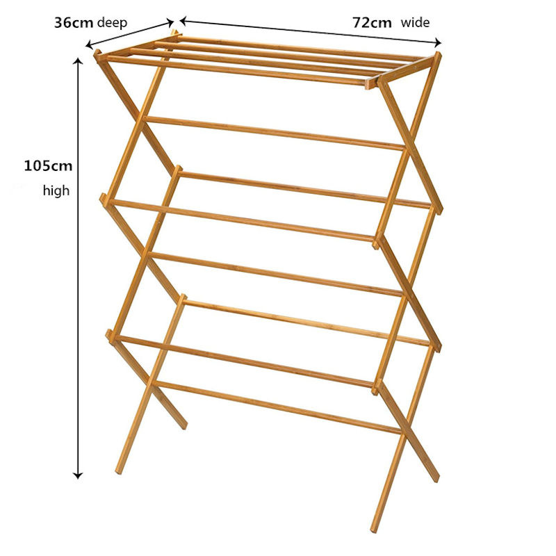 Met dit bamboe inklapbaar handdoekenrek kan je gewassen kledingstukken ophangen om te drogen. Het handdoekenrek heeft dan 11 stangen verdeeld op 6 niveaus om handdoeken, badhanddoeken en kledingstukken te kunnen drogen. Deze handdoekenstandaard kan overal neergezet worden en staat zeer stabiel. Daardoor is hij ook te gebruiken als wasrek of als kledingrek. Na gebruik is het rek eenvoudig op te vouwen en kan ruimtebesparend opgeborgen worden.