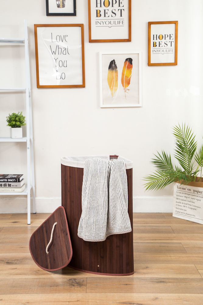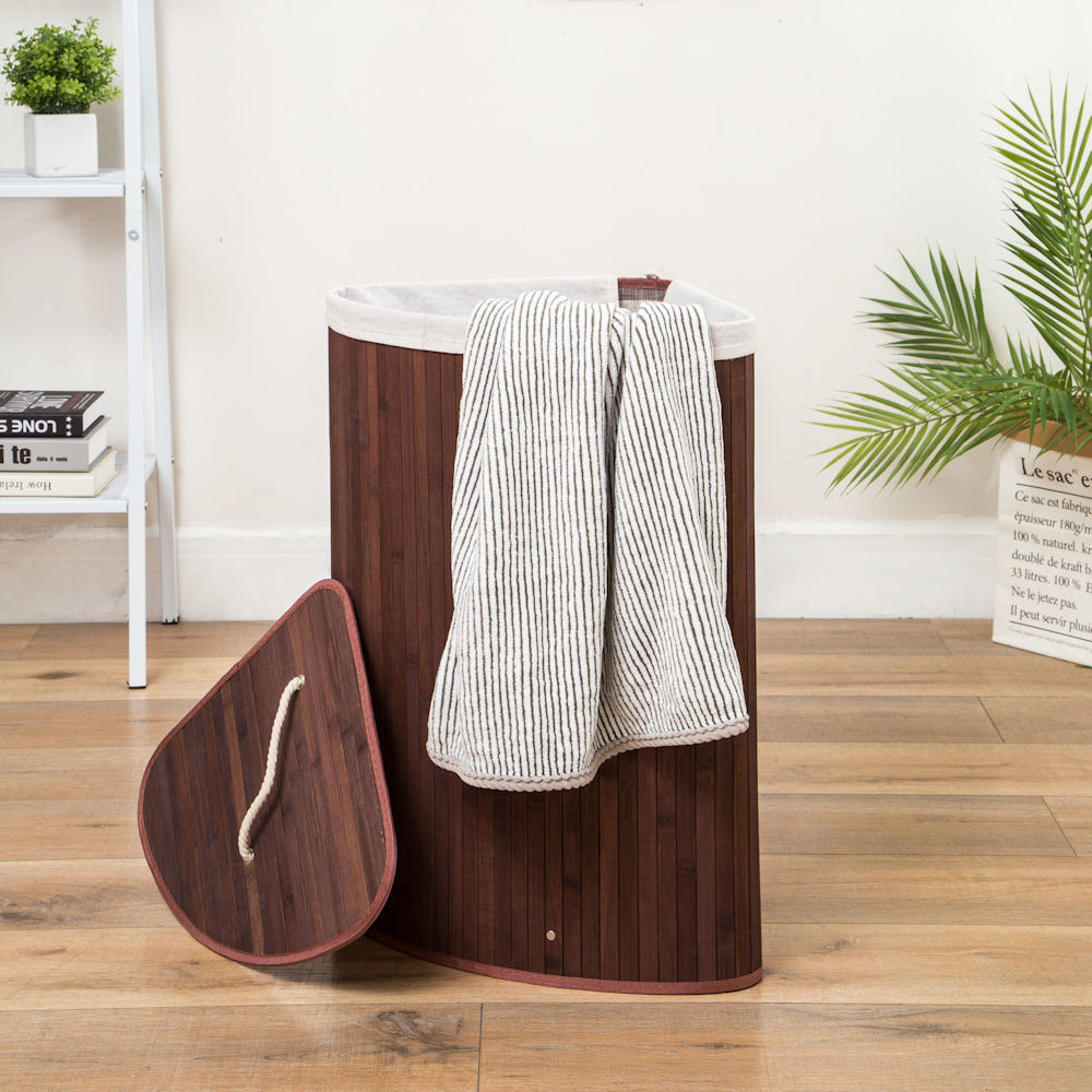 Decopatent Grote Bamboe Hoek Wasmand 1 vak met Deksel & stoffen Waszak - Bamboe wasbox wassorteerder Driehoek - Inhoud wasmand 100 liter - Wasmand voor wasgoed - Wasmanden Opvouwbaar - Wasmand met deksel - Kleur: Bruin - Decopatent®