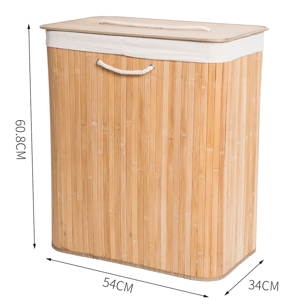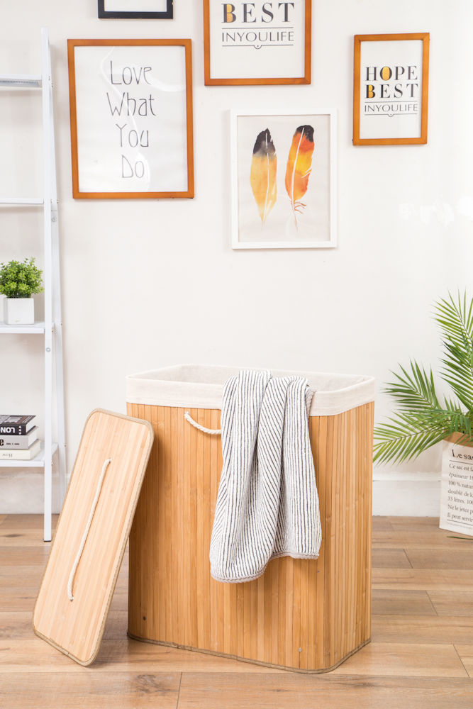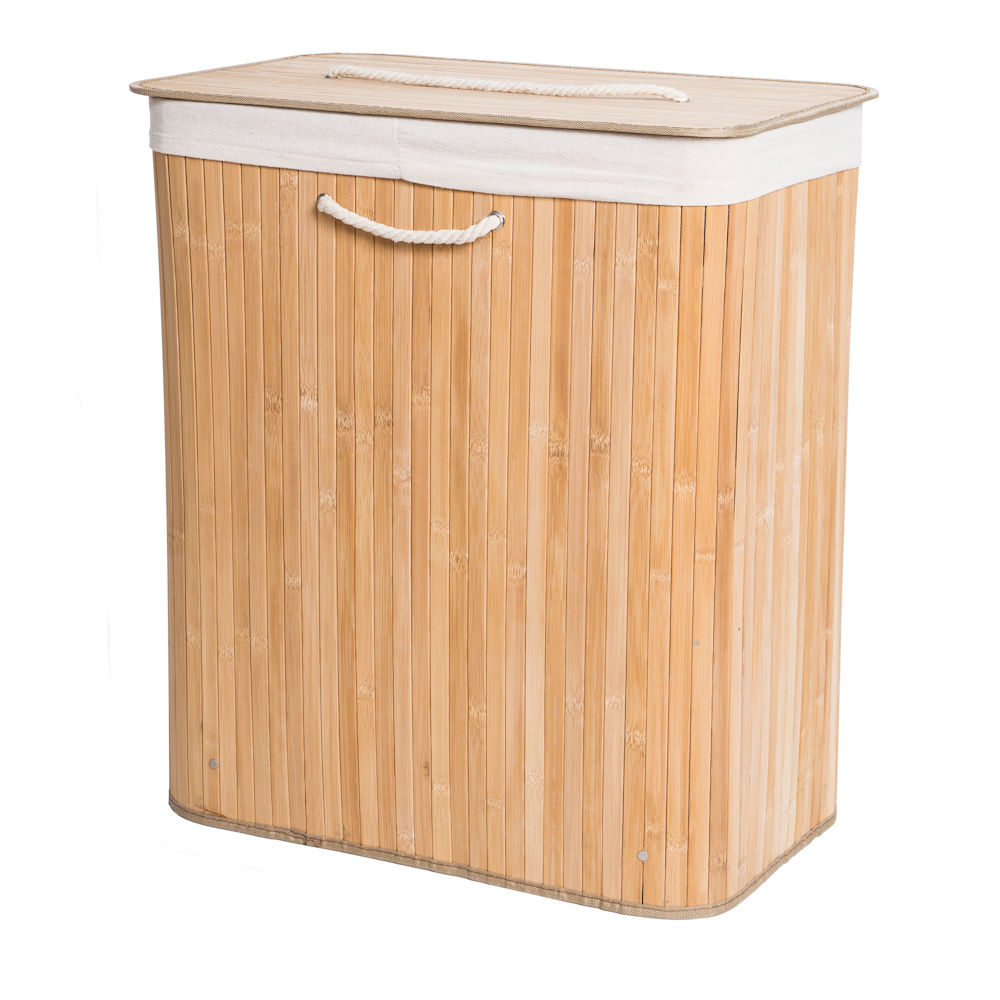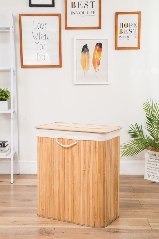 Met deze grote wasmand van bamboe met 2 vakken, koop je een praktische wasmand voor in jouw badkamer of was ruimte. Bamboe onderscheidt zich naast zijn geweldige uitstraling, vooral door zijn onderhoudsvriendelijke, stevige en vochtresistente eigenschappen. Deze wasmand met deksel en 2 vakken heeft een verwijderbare waszak, welke in twee compartimenten onderverdeeld is. Zo heb je altijd een goed overzicht en kan je de was eenvoudig op kleur of soort kleding sorteren.