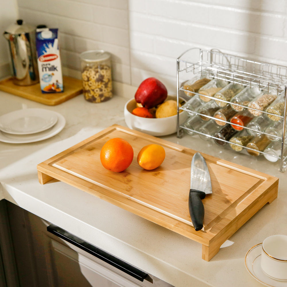 De snijplank heeft een slim design. Enerzijds door het lekgootje en anderzijds door de pootjes.