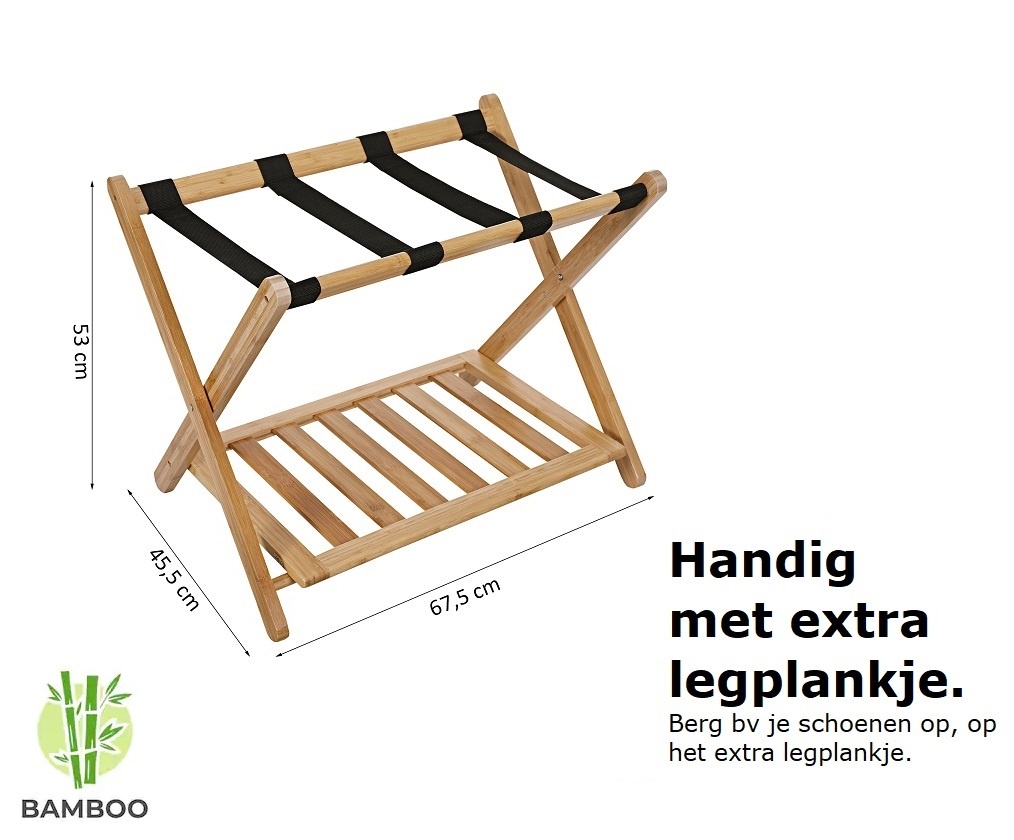 Dit bagagerek biedt niet alleen plaats aan een koffer, weekendtas of backpack. Dit luxe bagagerek heeft namelijk een extra plateau. Dit plateau is multifunctioneel en bijvoorbeeld zeer geschikt voor het opbergen van schoenen of pantoffels. De belangrijkste voordelen van dit bamboe bagagerek: