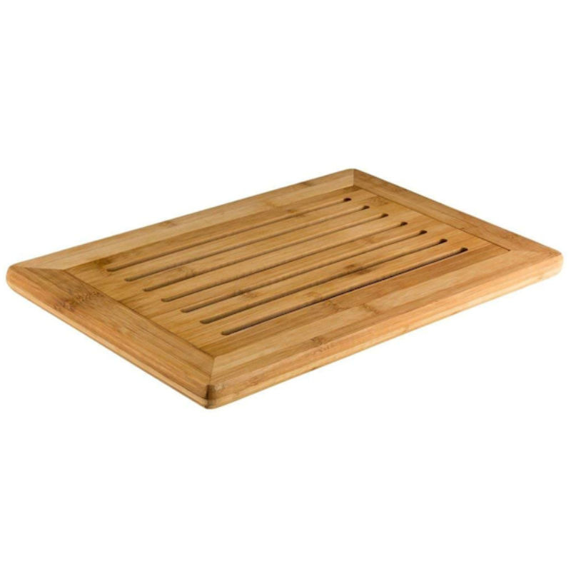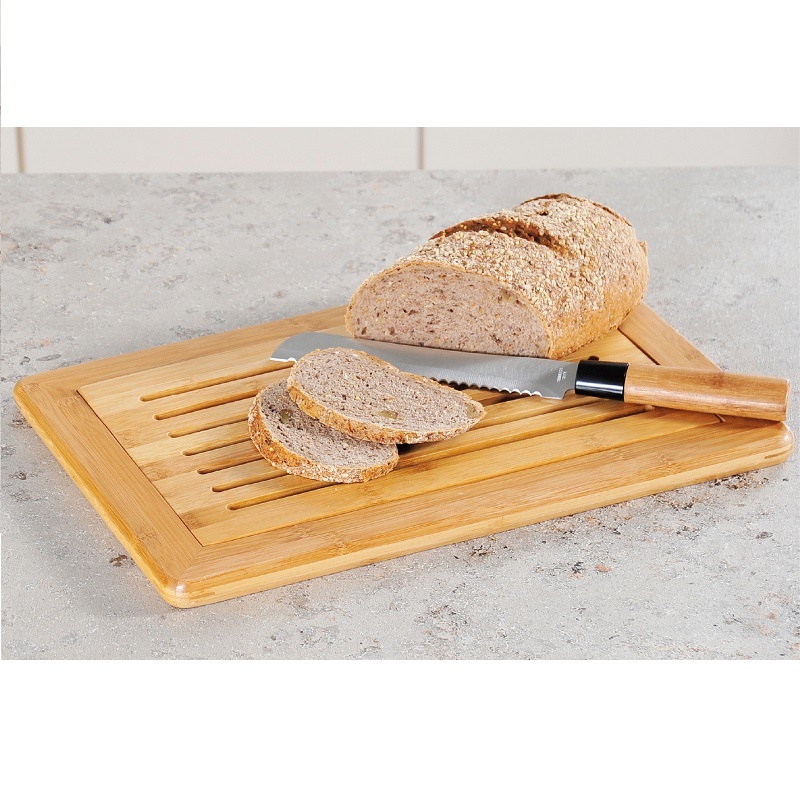 FSC Houten Bamboe Broodsnijplank + Kruimelvanger. Vers brood is natuurlijk het lekkerst, maar het snijden van vers brood is vaak een kruimelige aangelegenheid. Om te zorgen dat jouw werkblad en vloer kruimel vrij blijft, is er nu deze praktische broodplank met geïntegreerd vak om de kruimels op te vangen. Het rooster is uit de houder te nemen, waardoor de plank makkelijk schoon te maken is. De broodsnijplank onderscheid zich niet alleen door zijn natuurlijke en warme uitstraling. Doordat hij heel erg belastbaar is, is hij niet meer weg te denken uit de keuken. De snijplank is ook te gebruiken als dienblad of voor het snijden van andere producten. Een mes is bij de levering niet inbegrepen. Details van de broodsnijplank met kruimel bakje • Afmeting 42 x 28 x 2 cm • Met Kruimel opvang bakje • Gewicht: ca. 1 kg • Materiaal: FSC BamboeHout (Kruimelvak en rand), MDF (bodem) • Kleur: natuur • Voor brood en stokbrood • Groot genoeg voor een heel brood • Handig kruimel opvang bakje • Niet vaatwasmachinebestendig• Decoratie is bij de levering niet inbegrepen.