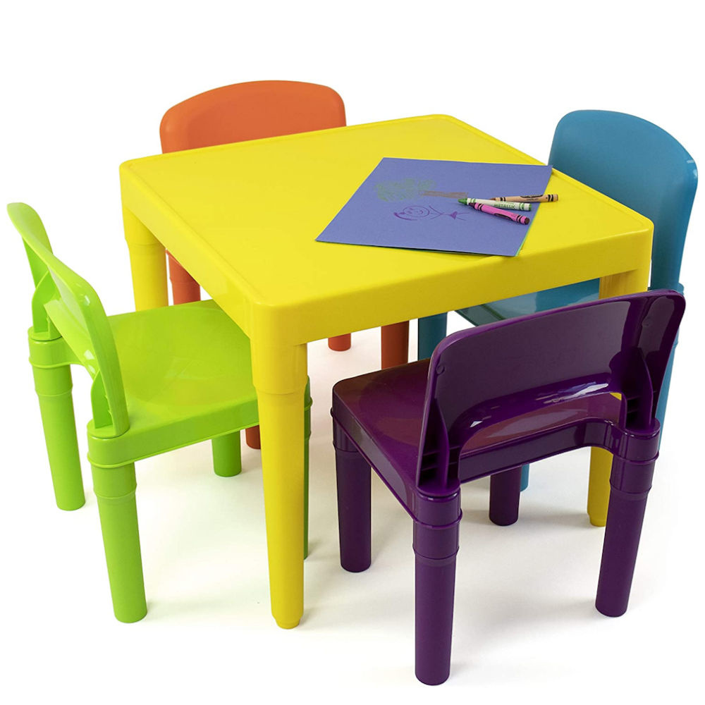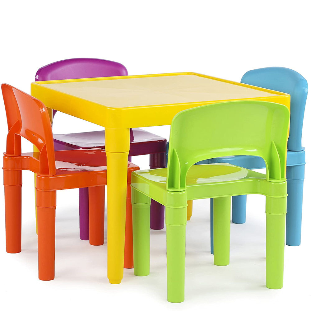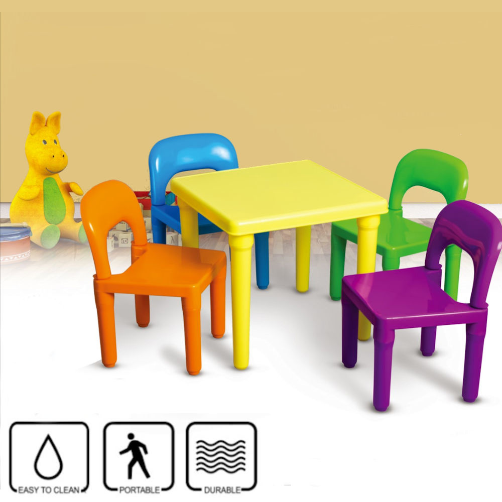 Decopatent Kindertafel met stoeltjes van kunststof - 1 tafel en 4 stoelen voor kinderen - Multi Color Gekleurde Tafel & Stoelen - Kleurtafel / speeltafel / knutseltafel / tekentafel / zitgroep set - Kindertafel en stoeltjes - Decopatent®