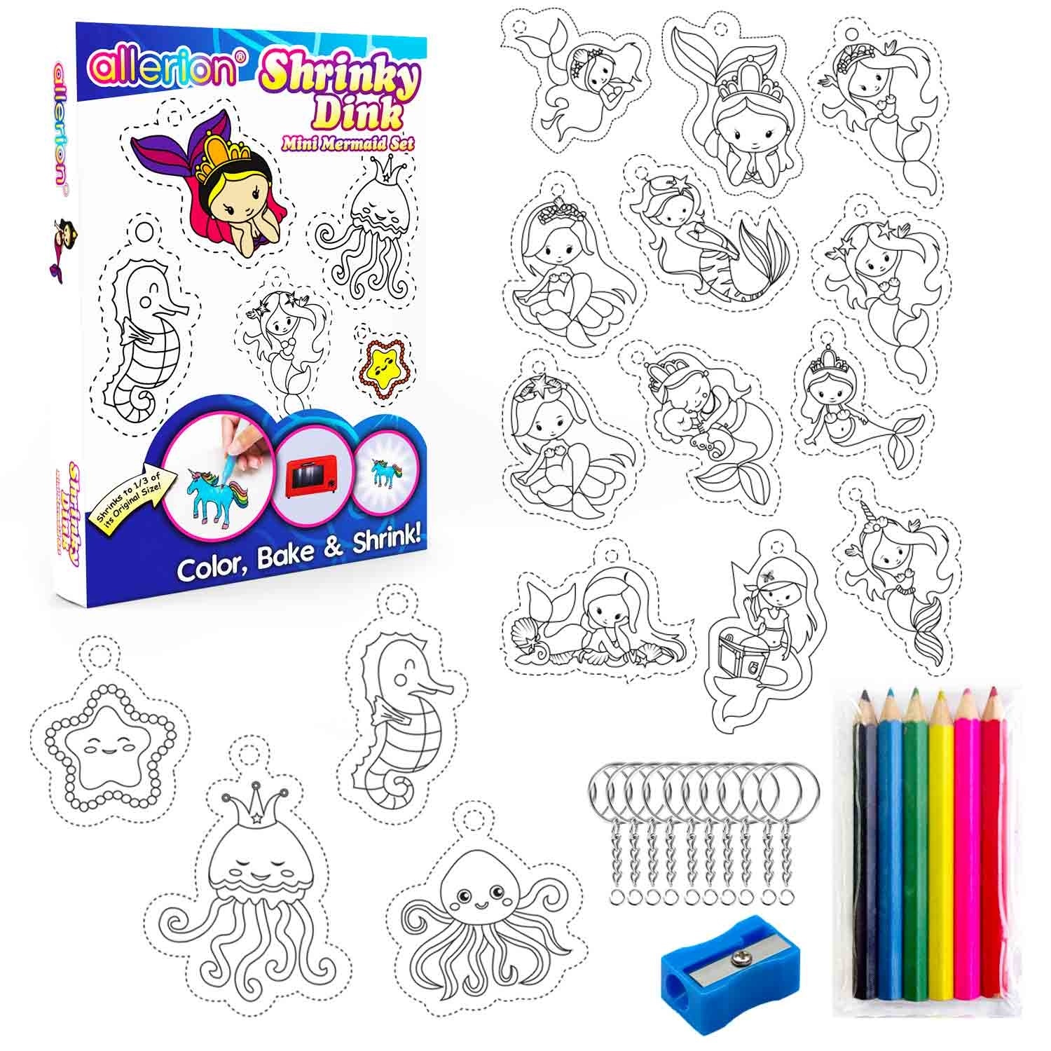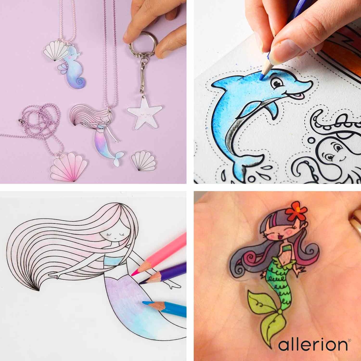 Sieraden en sleutelhangers maken met Krimpfolie! In thema Zeemeerminnen! Uitgebreide knutsel set, met verschillende voorbedrukte folies, accessoires en kleur potloden voor de mooiste zeemeerminnen projectjes. Inclusief handleiding. Krimpfolie verandert in de oven tot stevig plastic. Ideaal om zelf mee te knutselen! Inclusief handige opbergdoos.