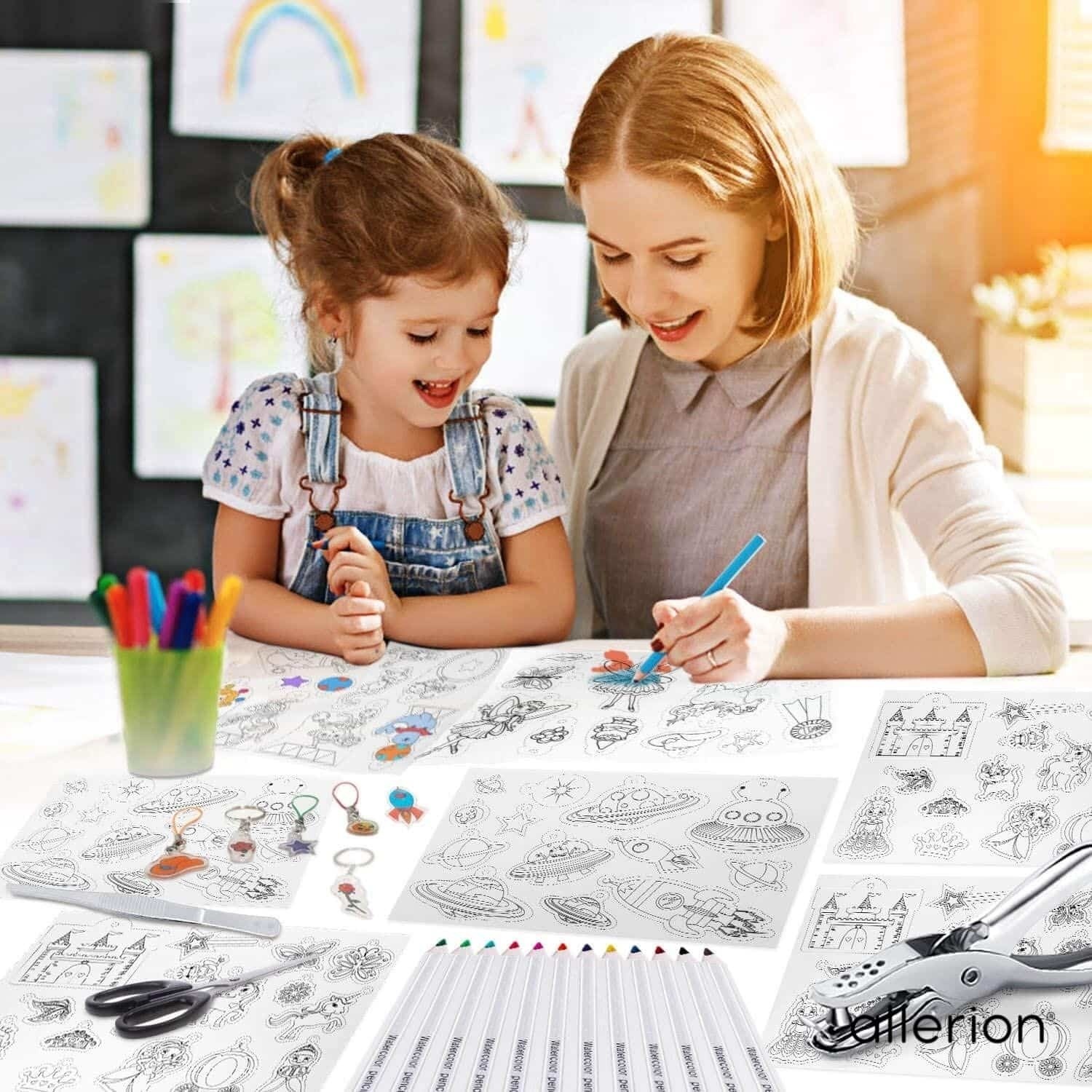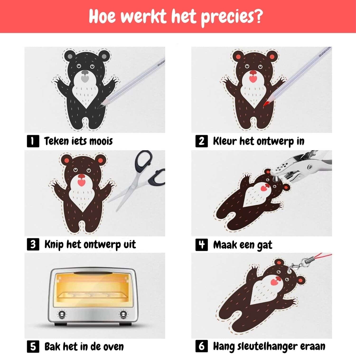 Krimpfolie, wie kent het niet nog van vroeger?! Maak een mooie tekening op een van de vellen krimpfolie, of kleur een van de bijgeleverde designs in. Laat je creativiteit de vrije loop! Knip jouw kunstwerk uit, en plaats het even in de oven. Het folie verandert in hard plastic en wordt een stuk kleiner. De bijgeleverde gebruiksaanwijzing maakt dat helemaal duidelijk. Perfect als sleutelhanger, sieraad of boekenlegger.