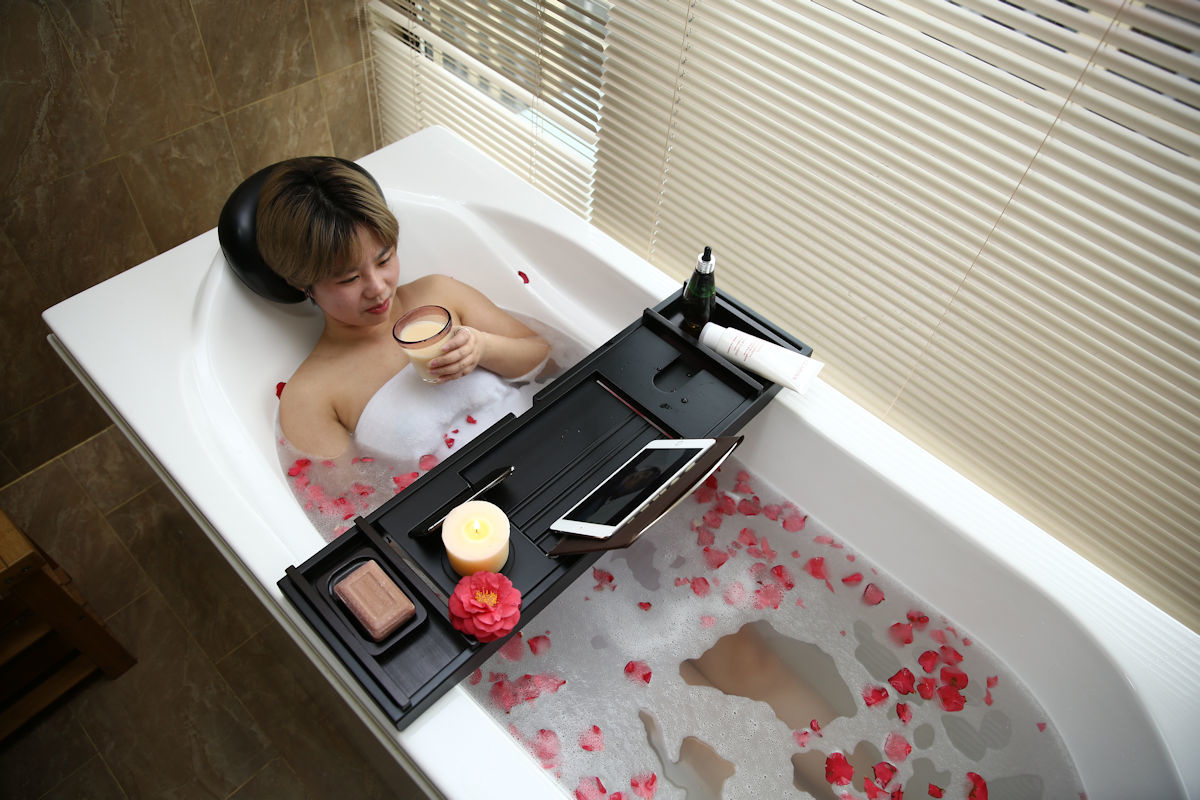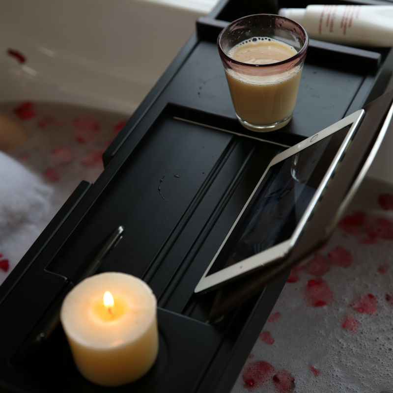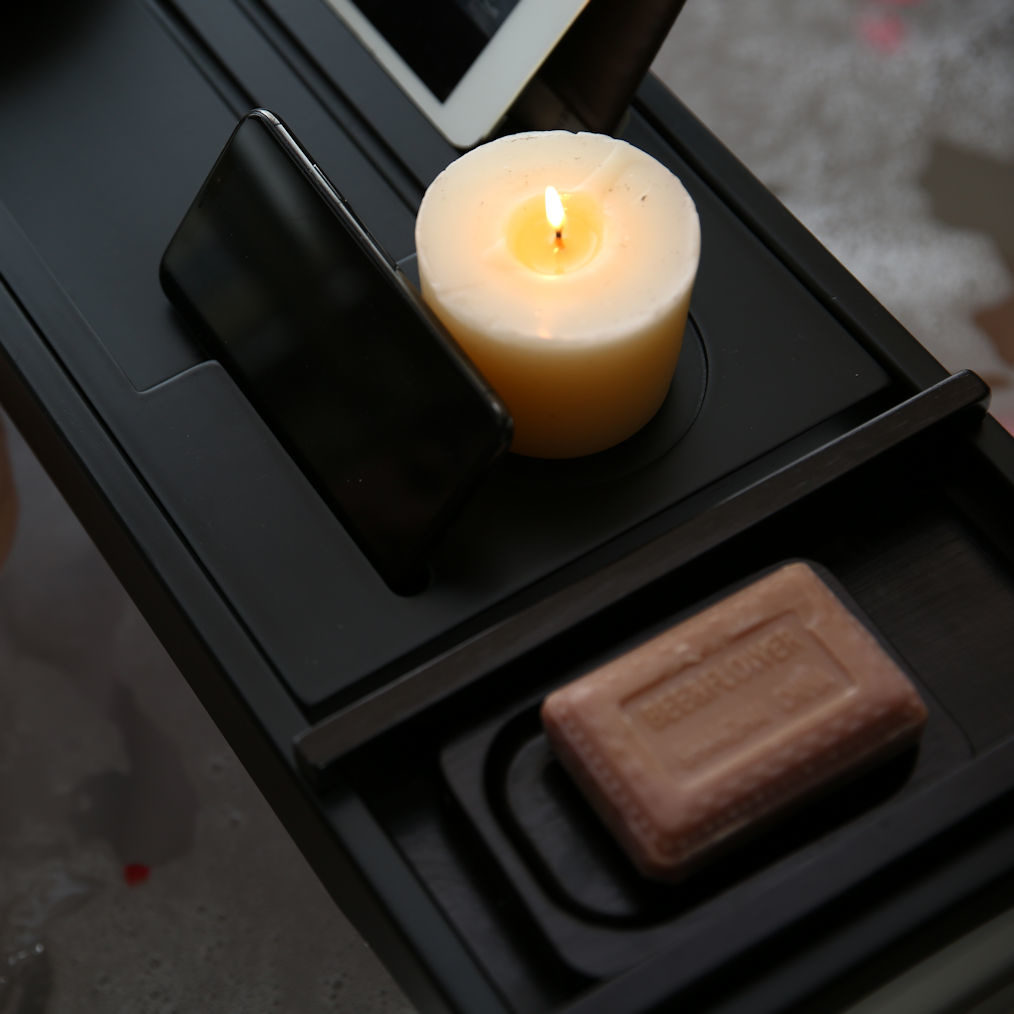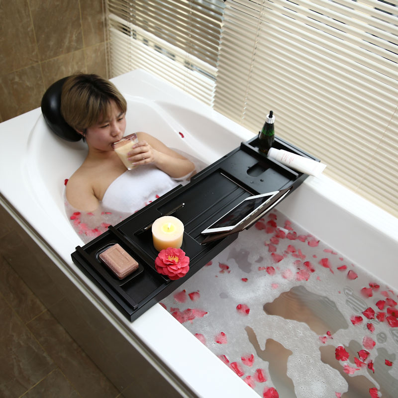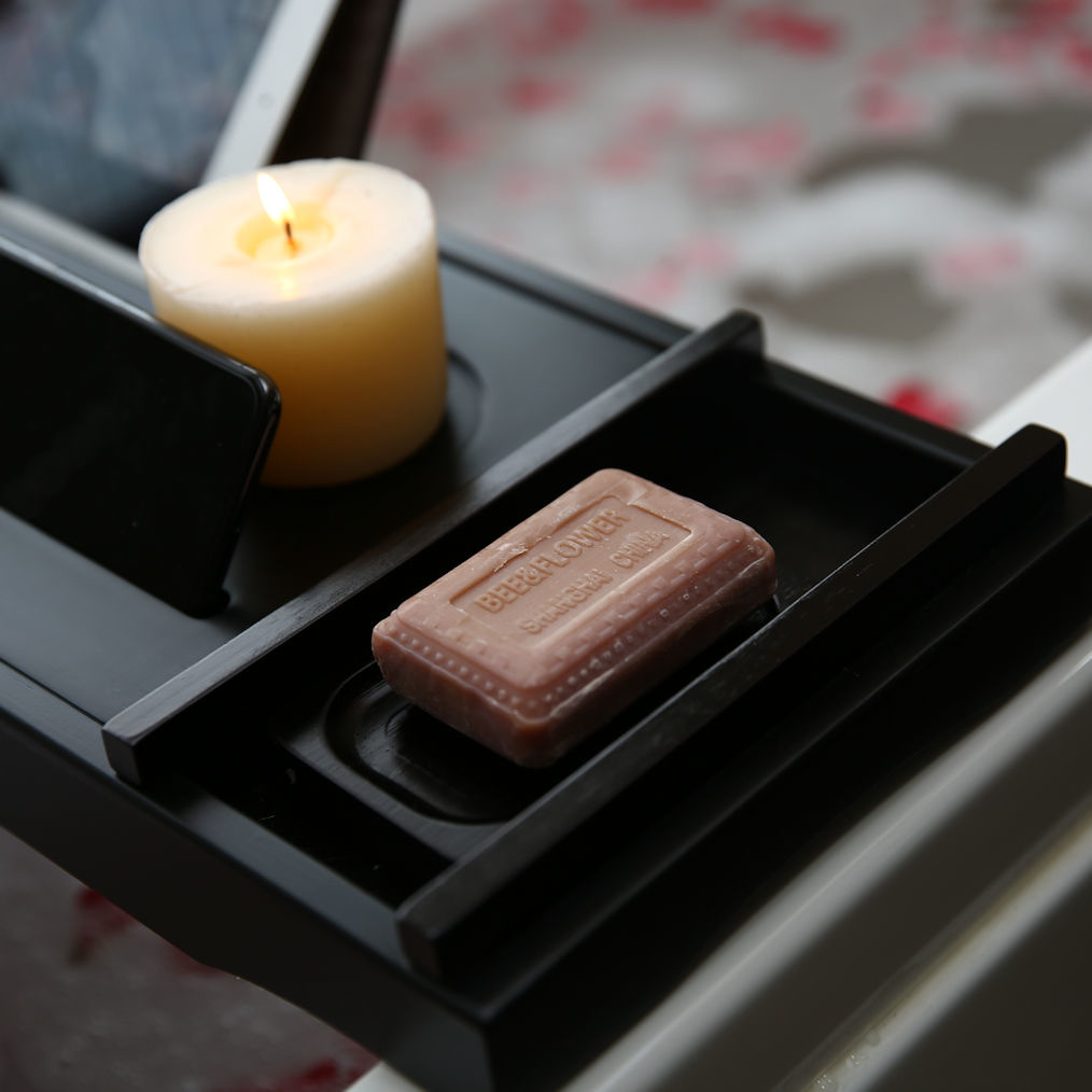 Luxe verstelbaar Bamboe Badrek. Heerlijk ontspannen in bad wordt nog lekkerder met dit mooie verstelbare luxe bamboe badrekje. Zo heb je alles binnen handbereik, je drankje. biertje of wijntje, chips, kaarsen, boek, telefoon en zelfs je tablet.