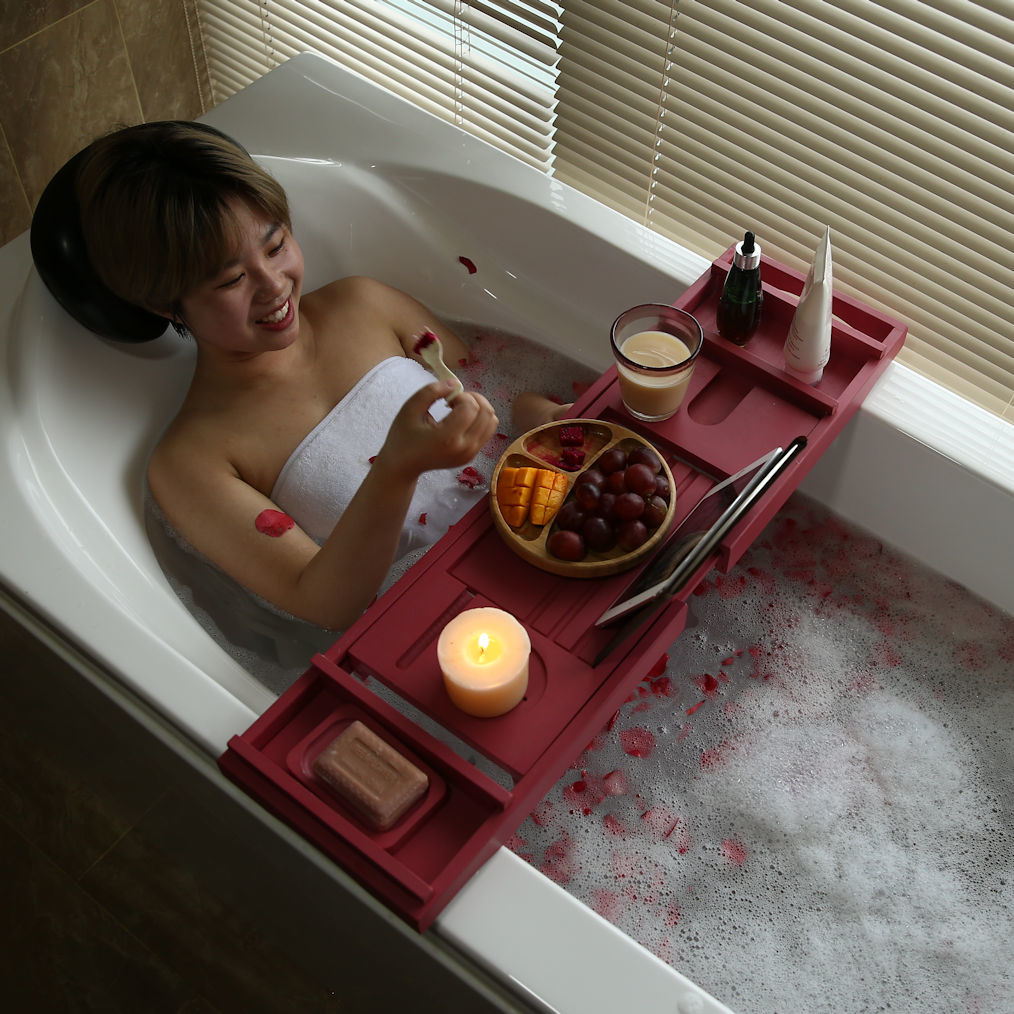 Luxe verstelbaar Bamboe Badrek. Heerlijk ontspannen in bad wordt nog lekkerder met dit mooie verstelbare luxe bamboe badrekje. Zo heb je alles binnen handbereik, je drankje. biertje of wijntje, chips, kaarsen, boek, telefoon en zelfs je tablet.