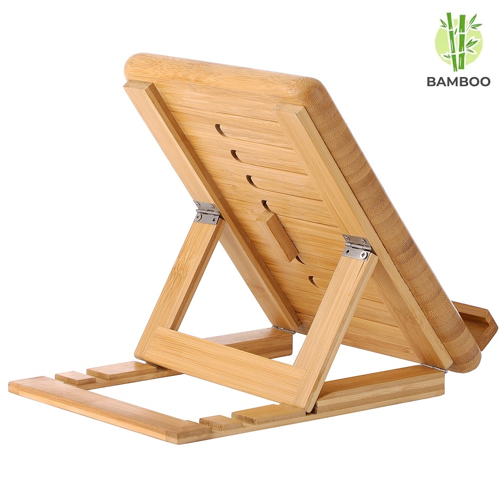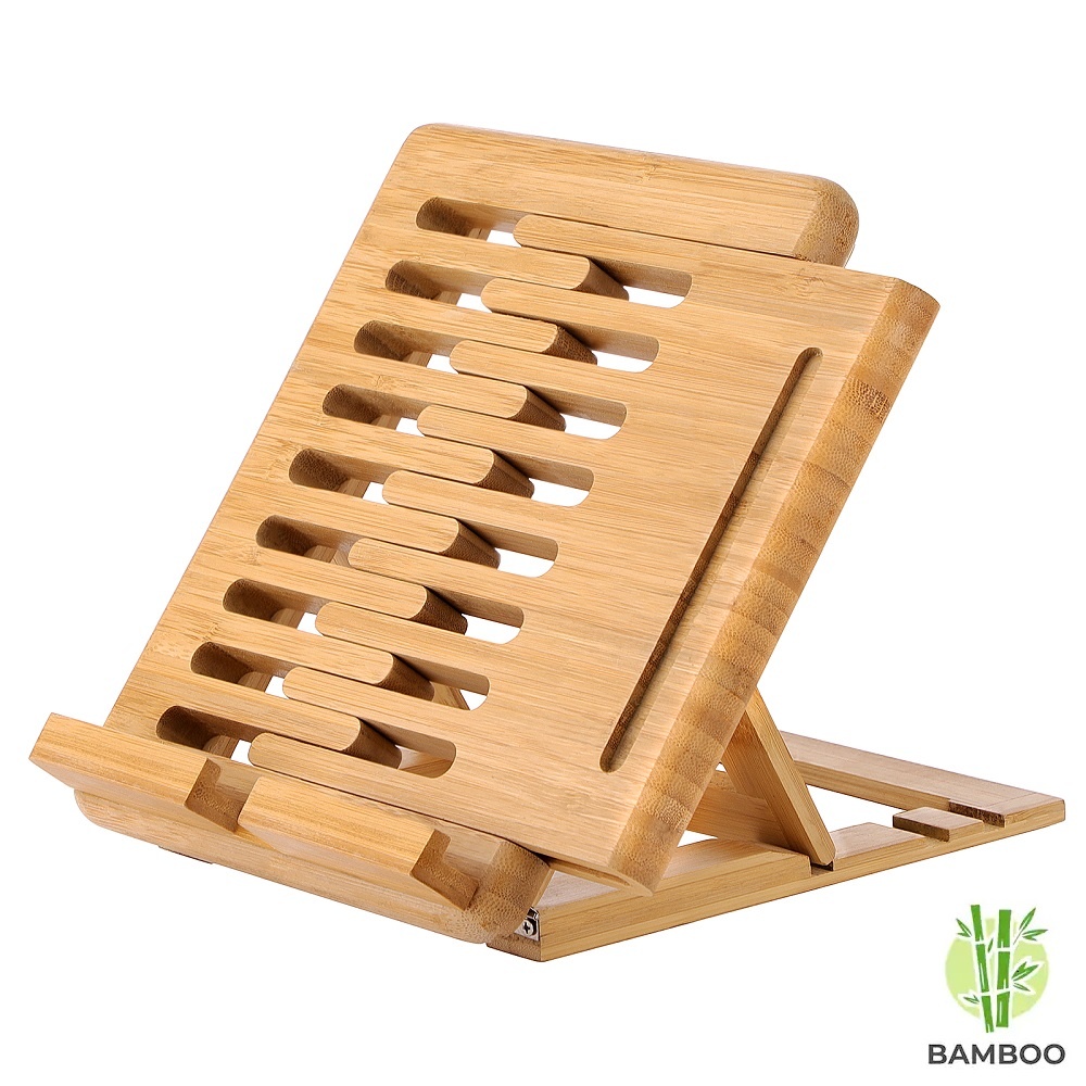 Handige bamboe boekenstandaard. Ideaal voor je kookboek of tablet. In hoogte & breedte verstelbaar en inklapbaar!