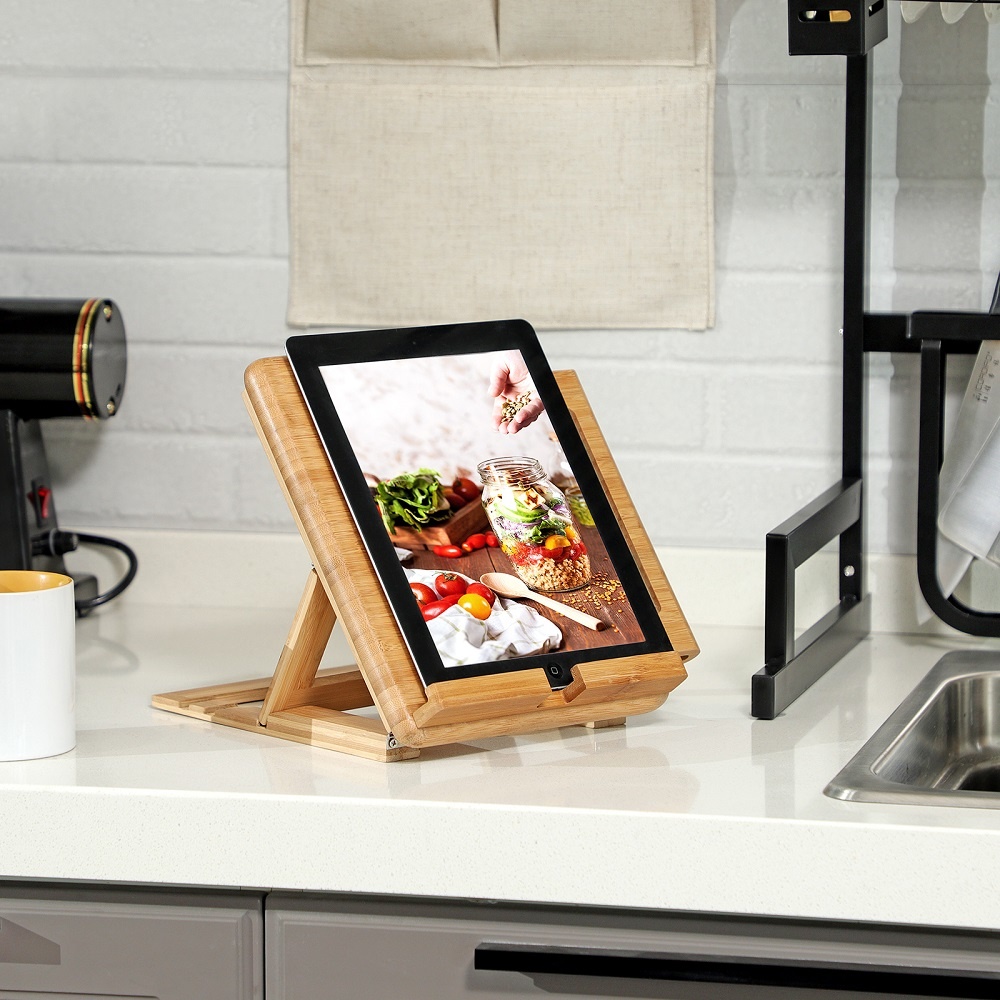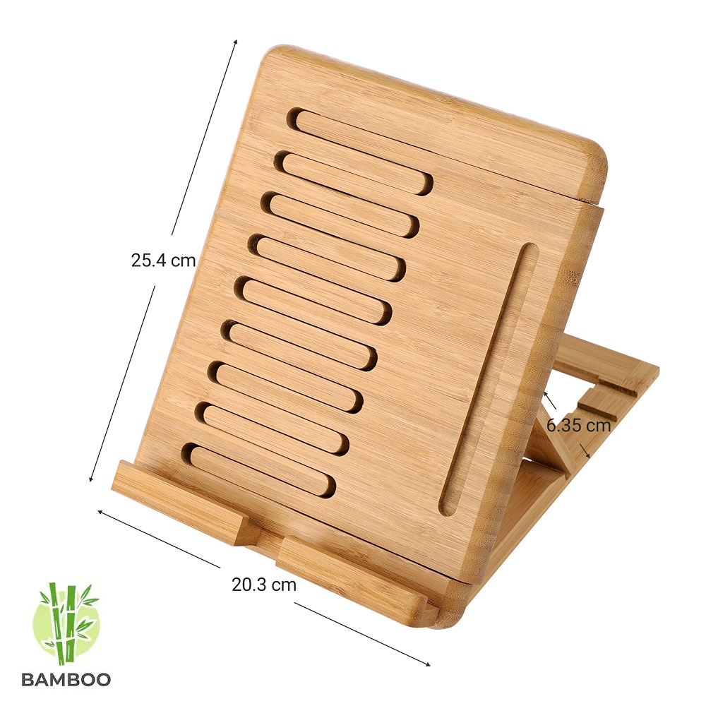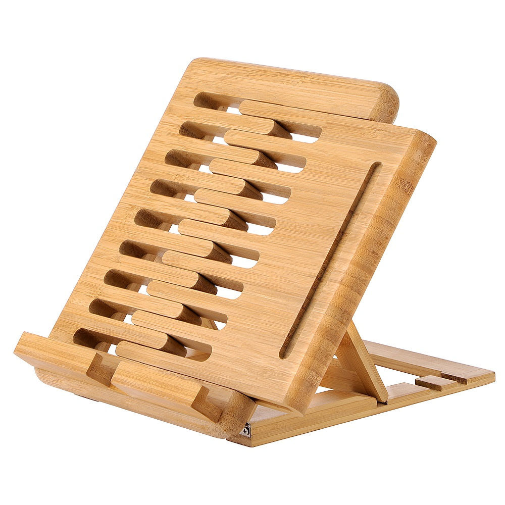 Deze luxe boekenstandaard is gemaakt van bamboe hout en is zeer geschikt voor gebruik in de keuken. Je verstelt hem makkelijk in hoogte en breedte. Daardoor is hij ideaal om je kookboek of tablet op te plaatsen. De voordelen van deze boekenstandaard: