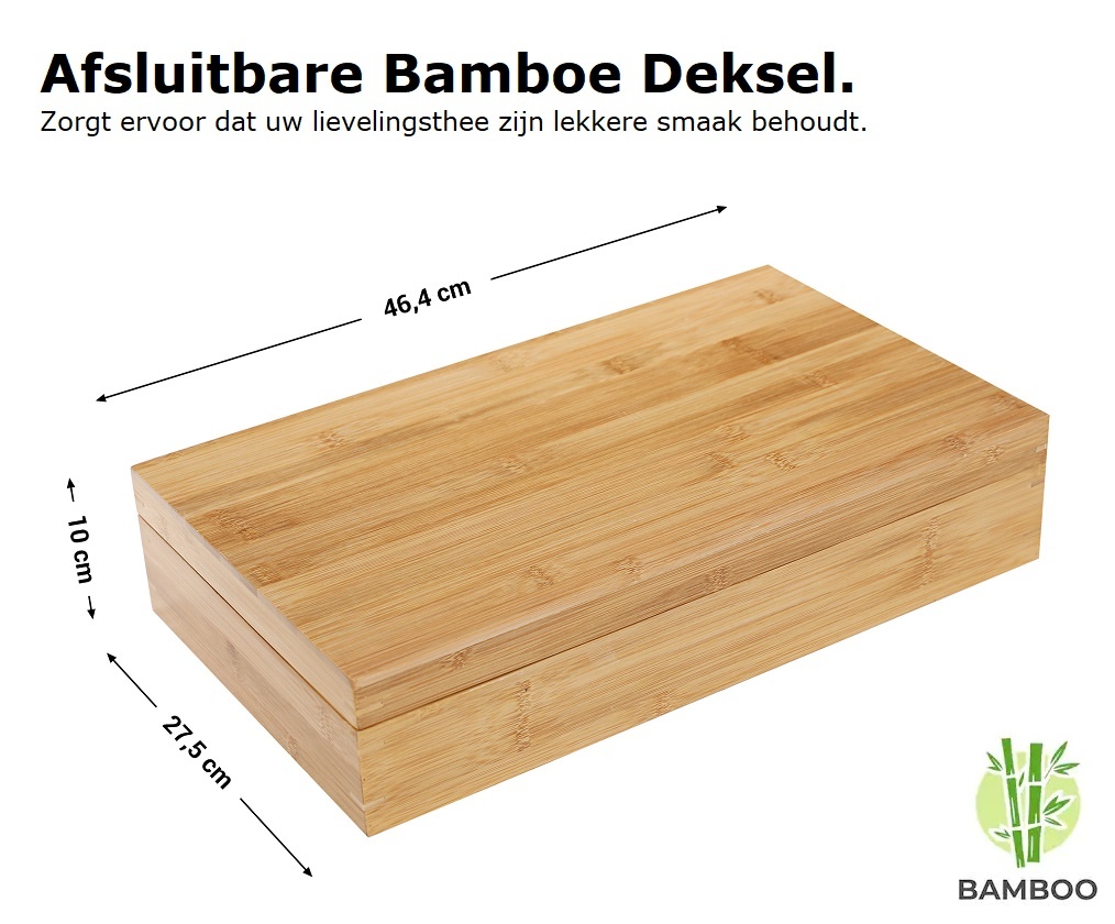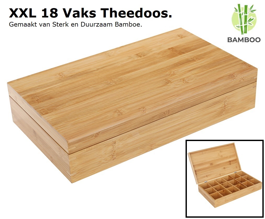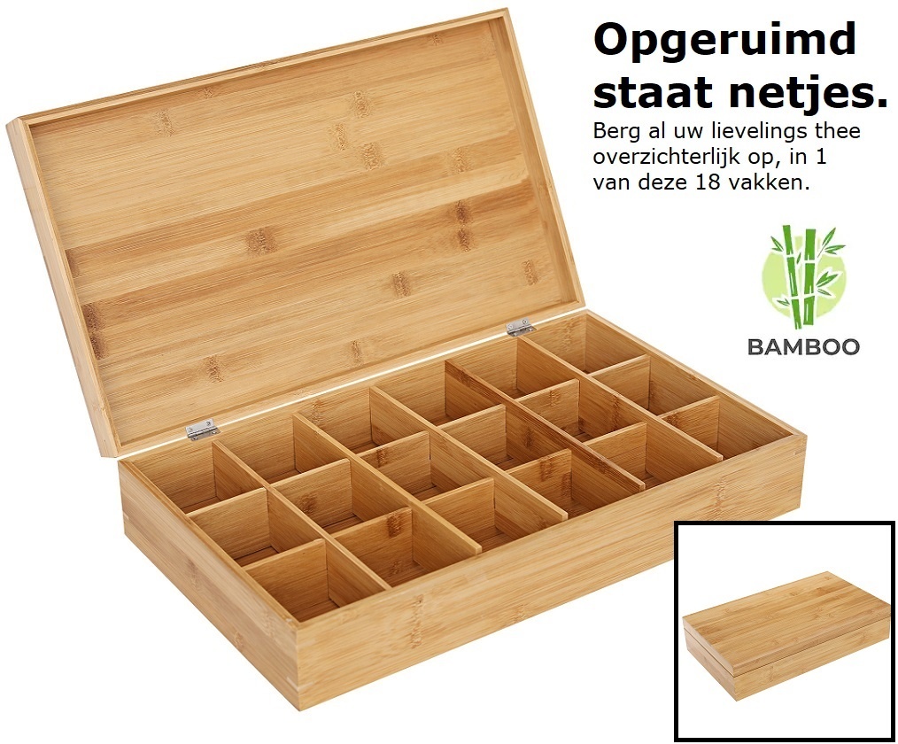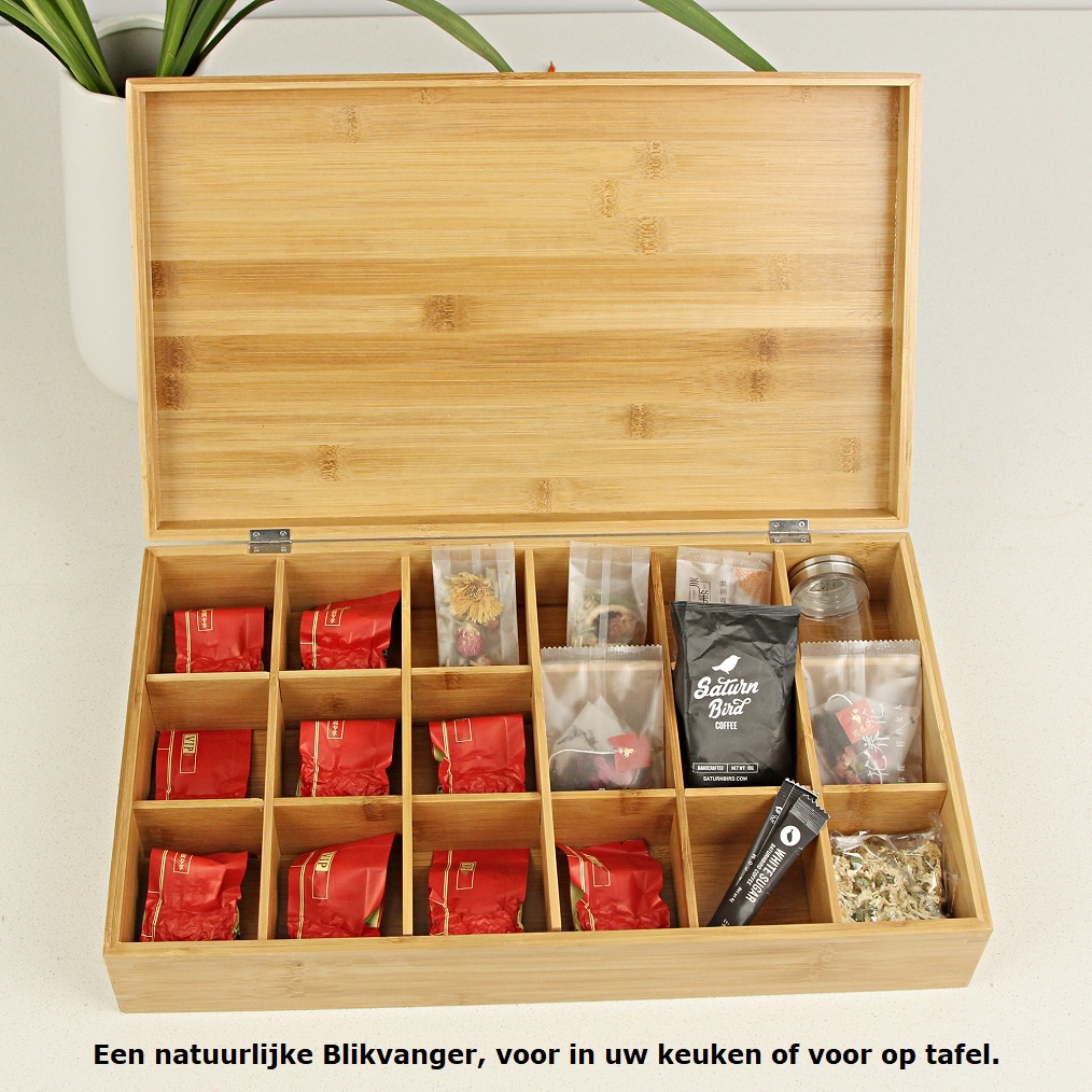 Luxe bamboe theedoos; presenteer verschillende theesmaken op een stijlvolle en luxe wijze in deze grote 18-vaks theedoos!