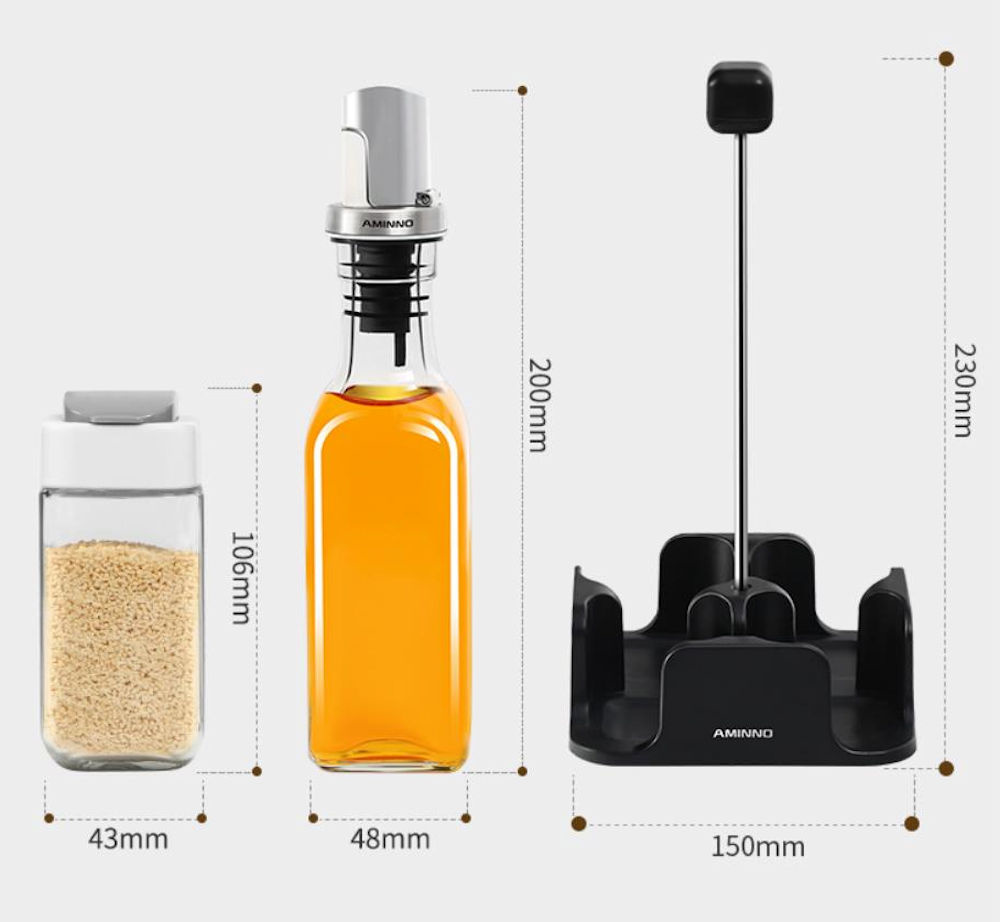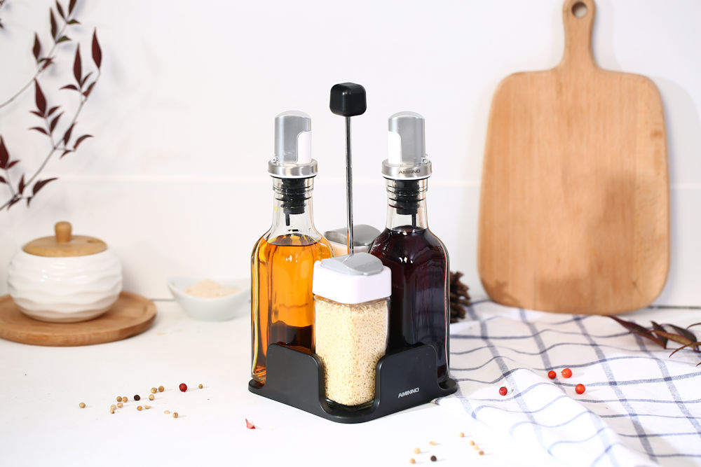 ✅ Houder inclusief: 1x Glazen Oliefles, 1x Azijnfles van Glas & 2 glazen specerijen potjes.