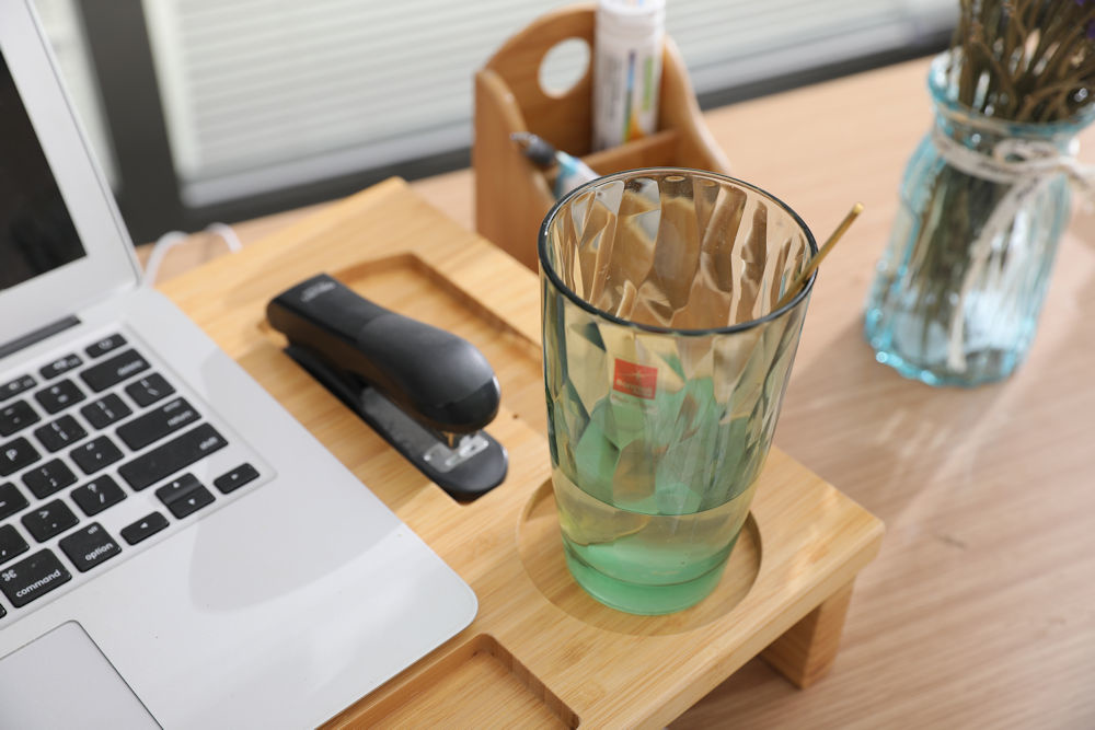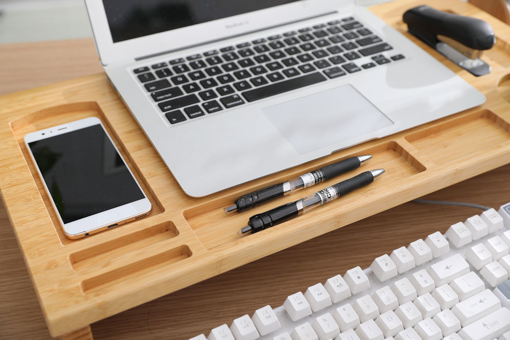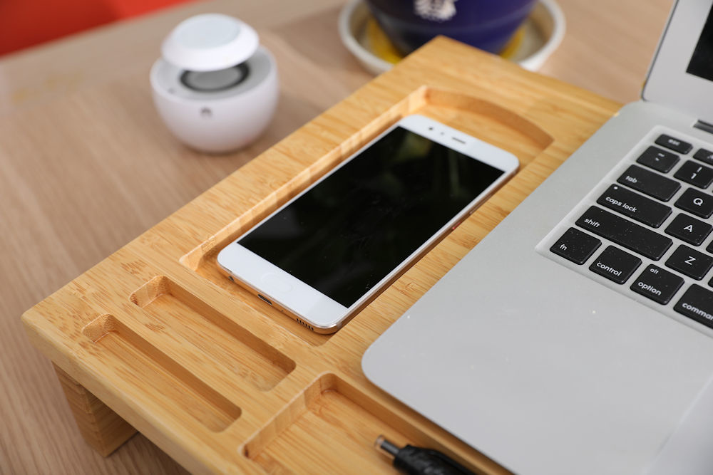 In het bamboe hout zijn 7 uitsparingen aangebracht. Erg handig want je bergt er makkelijk diverse dingen in op. Zo is er 1 uitsparing speciaal gemaakt voor je telefoon en is er 1 uitsparing waarin je een heerlijke kop koffie of thee kwijt kan. De overige uitsparingen zijn universeel te gebruiken voor wat kleine bureau-artikelen zoals pennen en potloden.