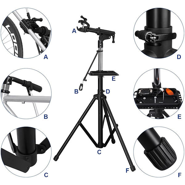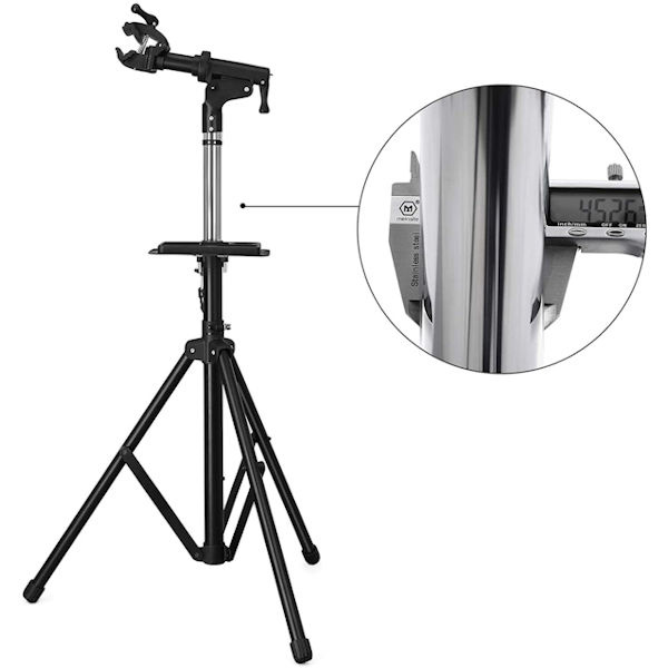 Hij is ten eerste voorzien van een klem met snel-sluiting, die 360 graden draaibaar is. Ten tweede is hij makkelijk in hoogte verstelbaar. Ten derde is hij voorzien van een groot gereedschapsbakje met magneet, zodat je gereedschap makkelijk even kan wegleggen. Daarnaast is hij voorzien van een stuurhouder waarmee je het stuur vastzet waardoor deze niet in de weg zit.