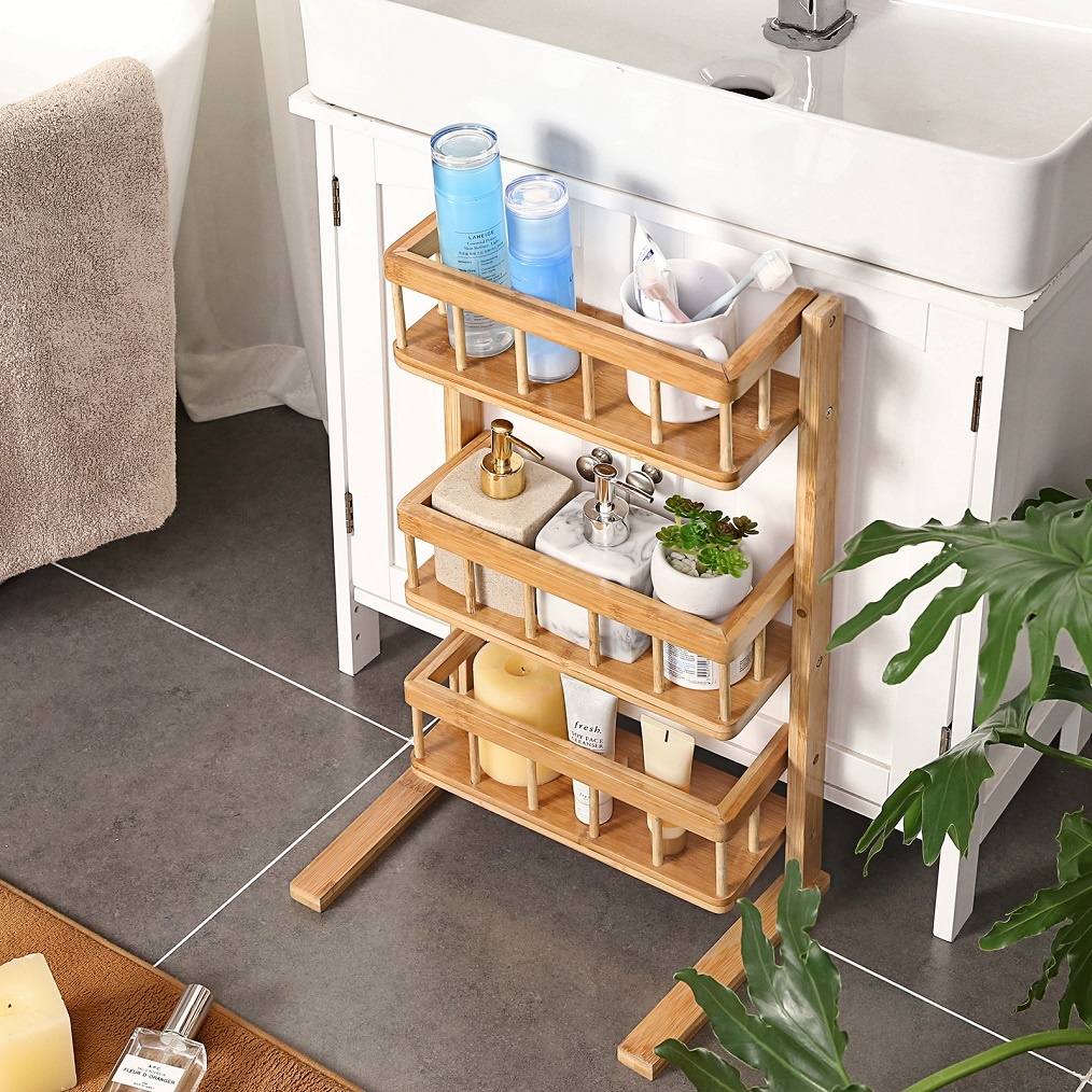 Dit opbergrek is gemaakt van bamboe hout. Bamboe is een natuurlijk materiaal en heeft veel goede eigenschappen. Zo ziet het er niet alleen mooi uit, het is ook nog eens ontzettend stevig. Ook is bamboe van nature goed resistent tegen water. Omdat bamboe een natuurlijke uitstraling heeft en goed resistent is tegen water, is het een perfect materiaal voor gebruik in de badkamer, keuken of in een washok.
