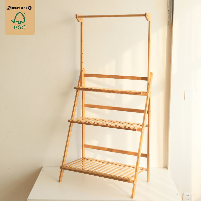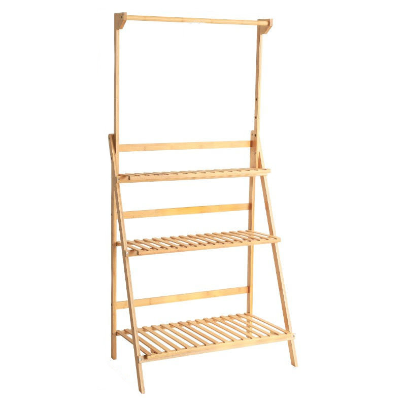 Leuk multifunctioneel staand plantenrek / bloemenrek van bamboe hout. In de vorm van een trap met 3 etages + handige stang voor hangplanten.