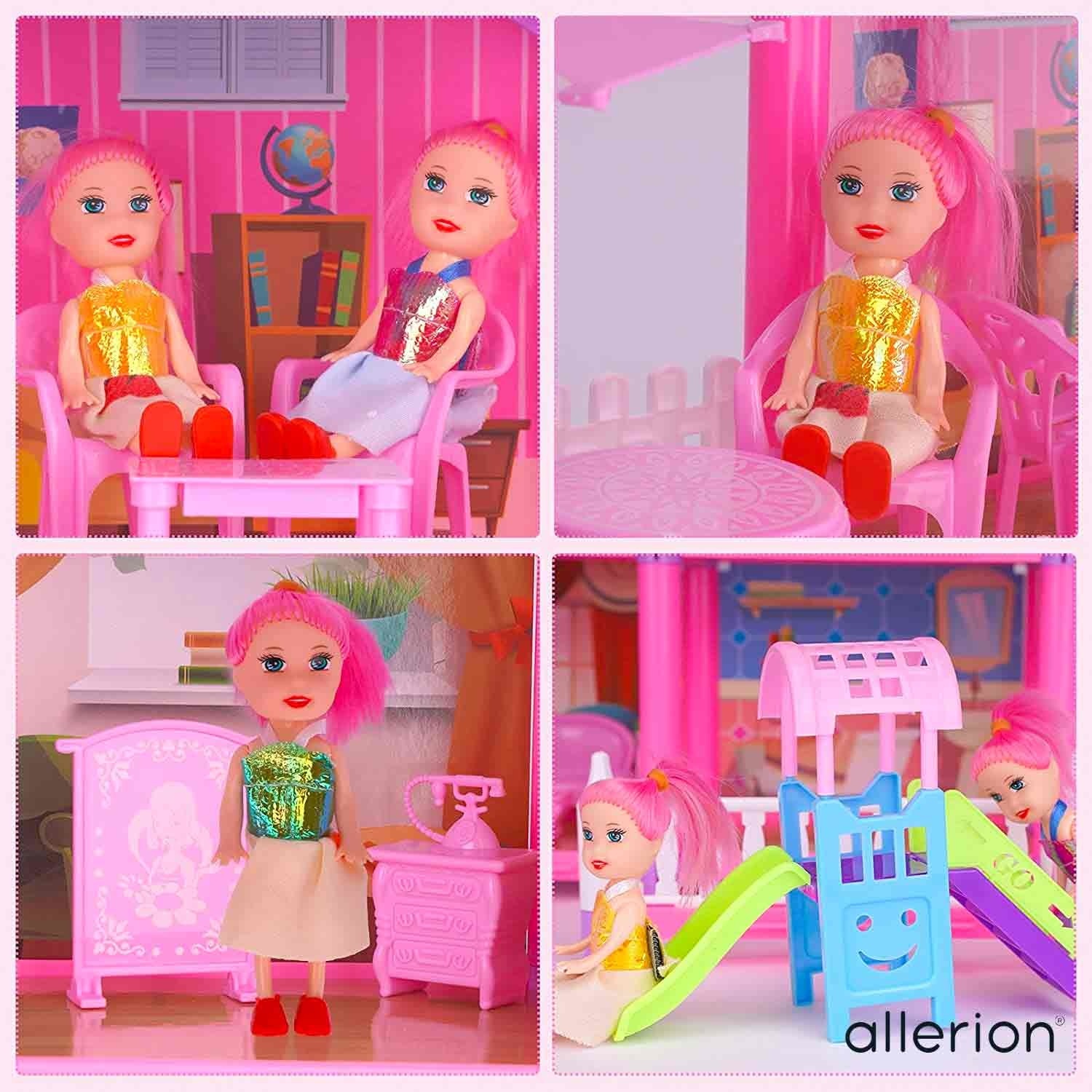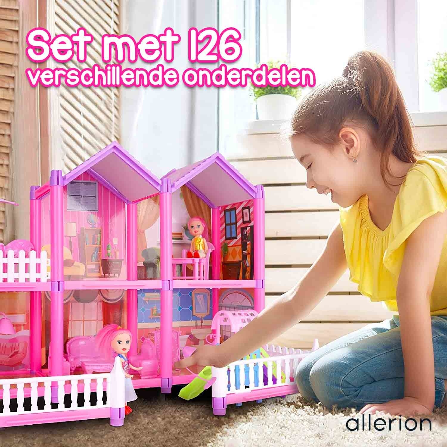 Allerion Allerion Poppenhuis - Met Meubels en Poppen - Inclusief Accessoires - 126-delig - Roze