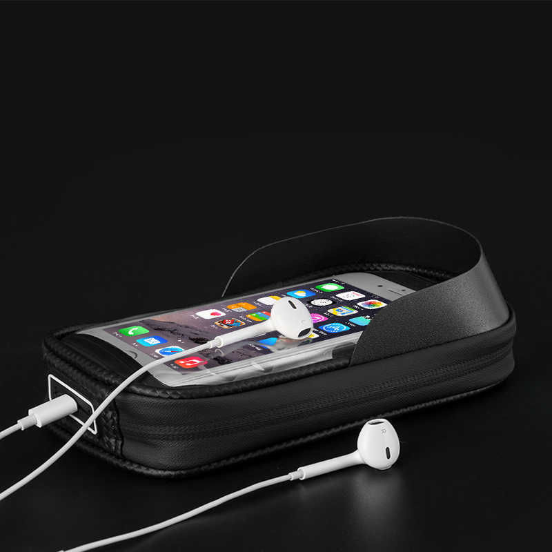 De touchscreen telefoonhouder is eenvoudig afneembaar, omdat deze doormiddel van klittenband ovenop de frametas zit bevestigd.
