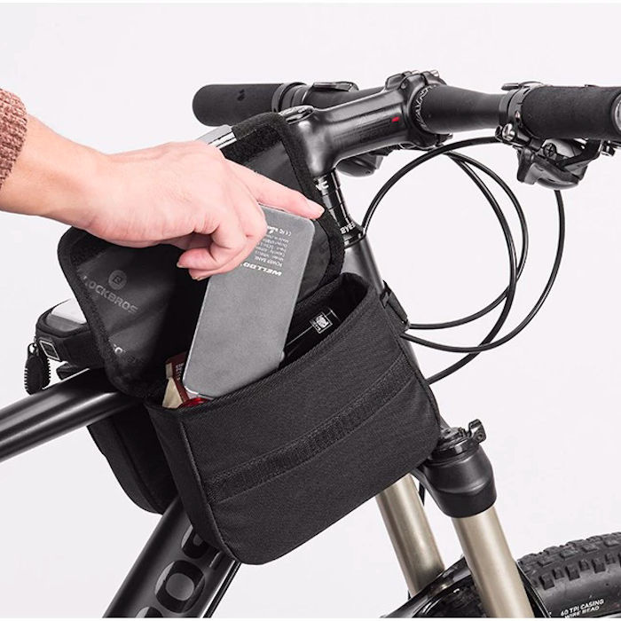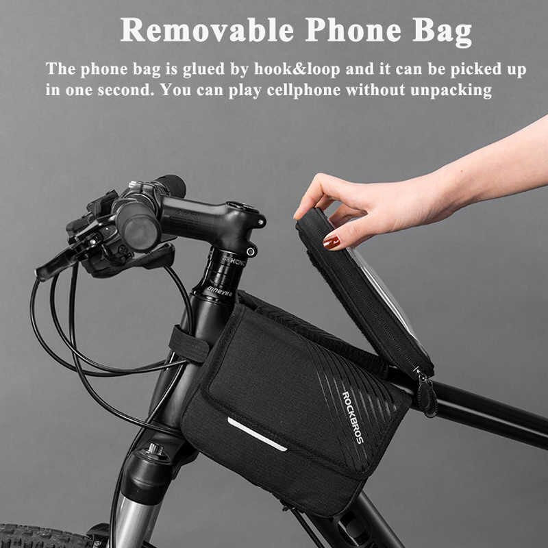Met deze fiets frametas met afneembare telefoonhouder heb je altijd al je belangrijke spullen binnen handbereik. Denk hierbij aan bijvoorbeeld aan jouw telefoon en fiets gereedschap om eventuele snelle fiets reparaties uit te voeren, maar ook om zaken in op te bergen zoals geld, pasjes, etc.