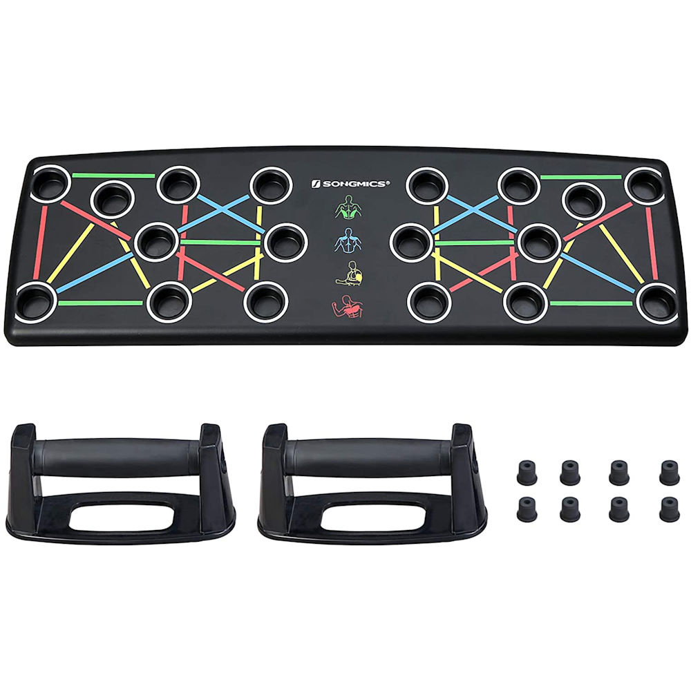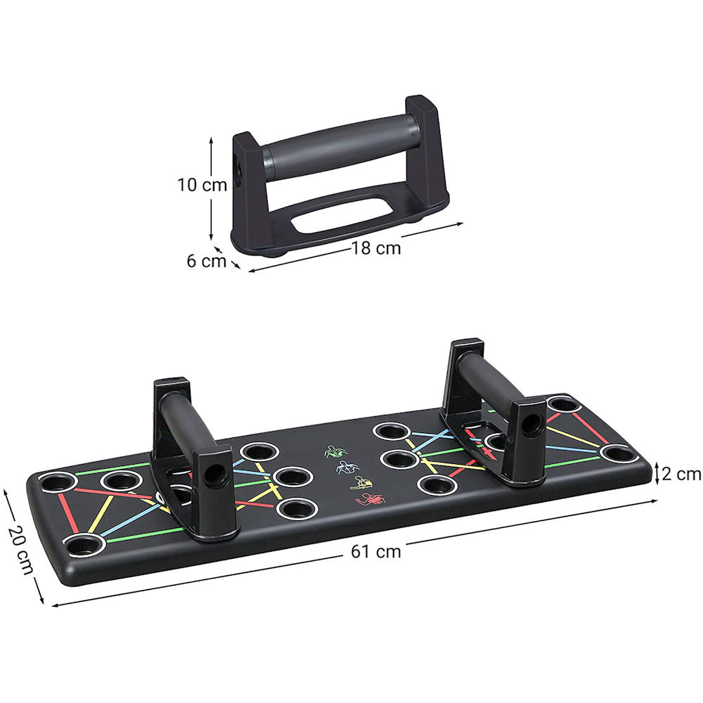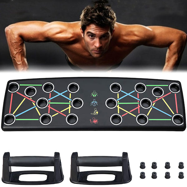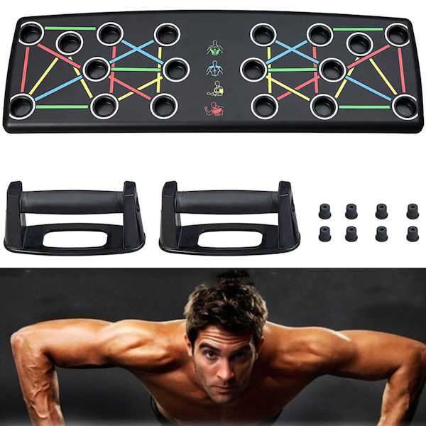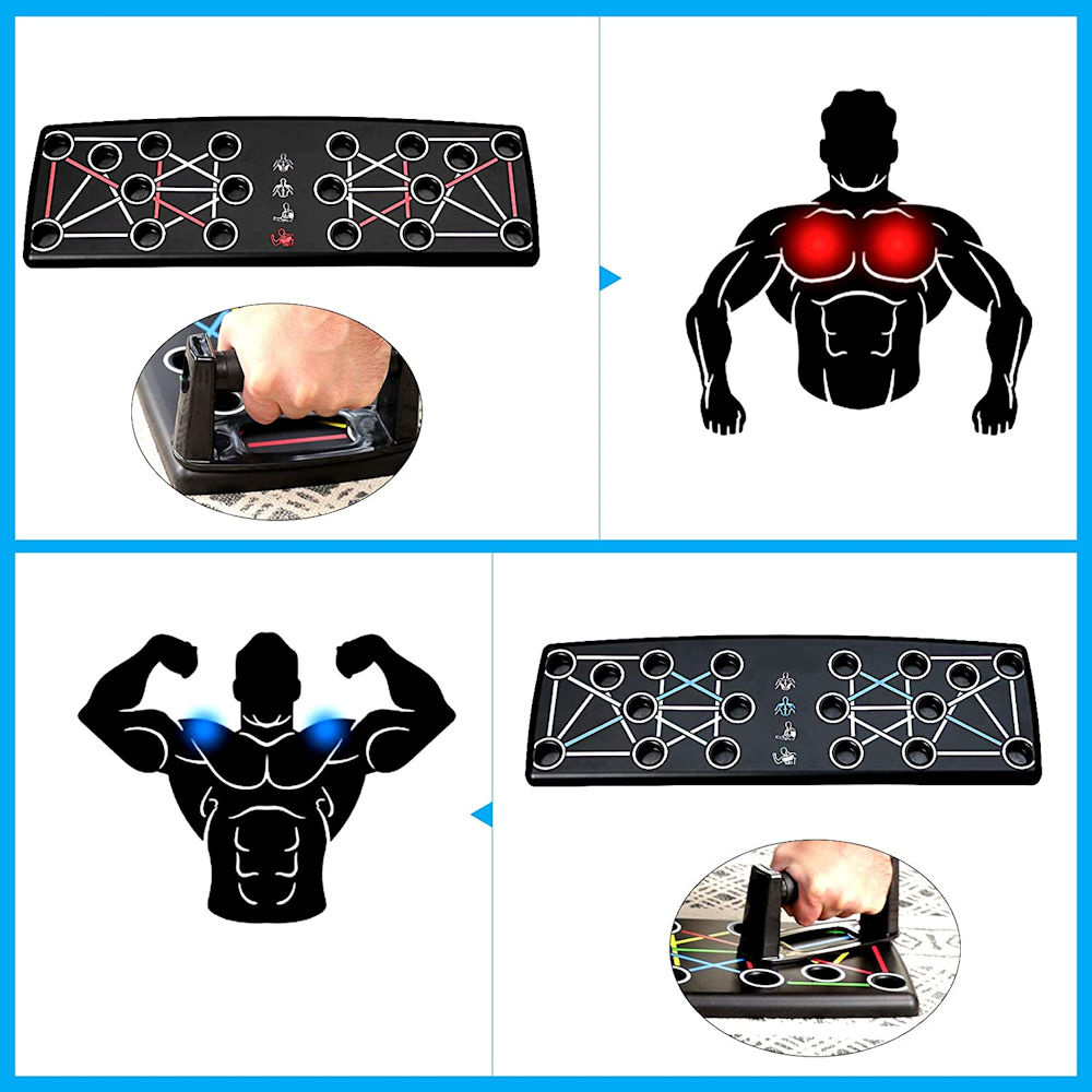 Met dit push up board train je de borst, schouders, rug en armen nog beter tijdens je push ups. Dat komt omdat je met dit push up bord de handvatten (en dus handen) op de juiste manier neerzet. Daardoor hebben de oefeningen een groter effect. Tevens krijgen je polsen, handen en ellenbogen juist meer rust. Dit push up bord is eigenlijk onmisbaar als je push ups goed wil doen.