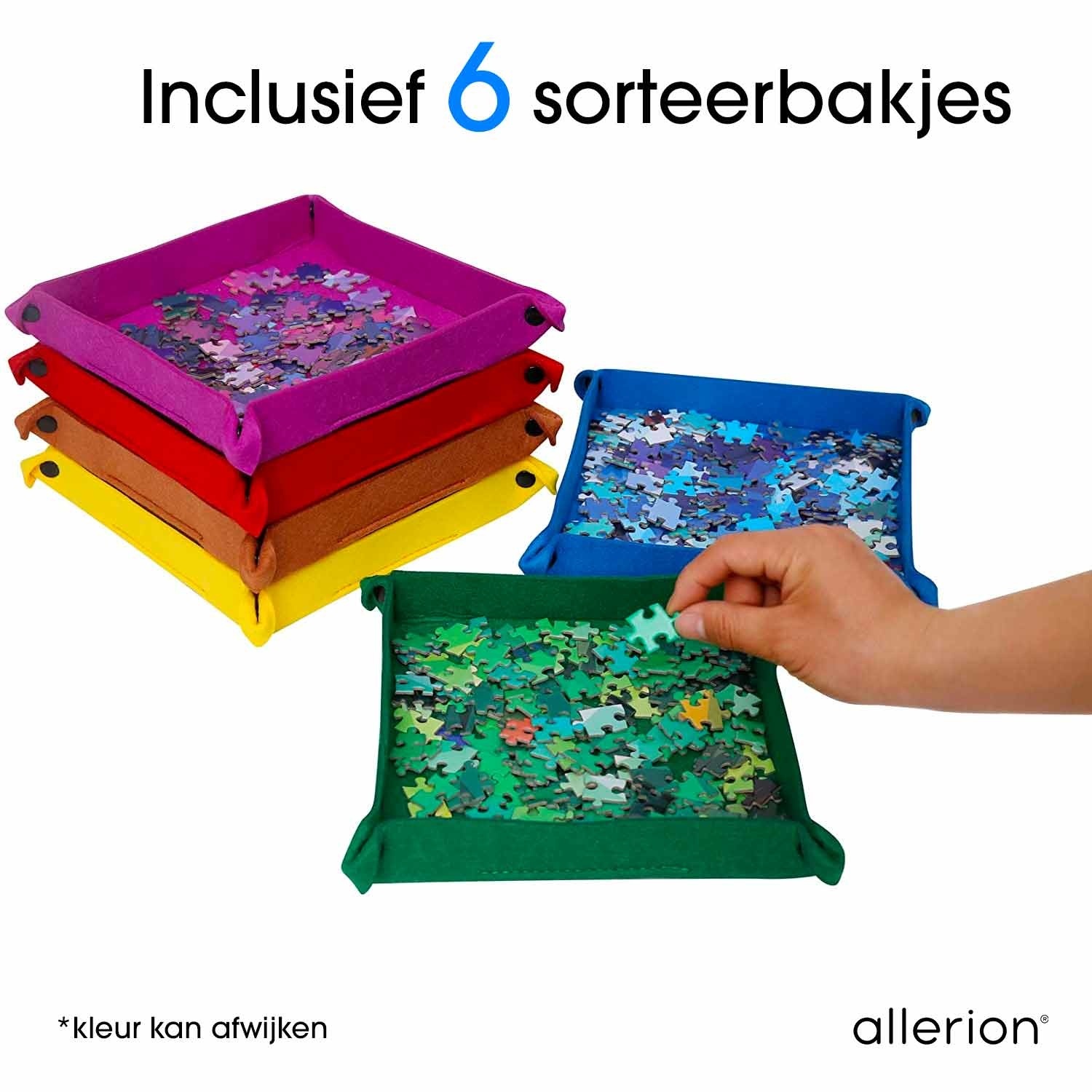 Met deze puzzel accessoire set maak jij elke puzzelaar blij. Naast alle onderdelen voor de puzzelmat, bevat de set ook 6 handige sorteerbakjes. Hierin kun jij verschillende stukjes gemakkelijk sorteren, en dat voorkomt rondslingerende stukjes. Neem je puzzel overal mee naartoe, of berg hem even op als je de ruimte nodig hebt!