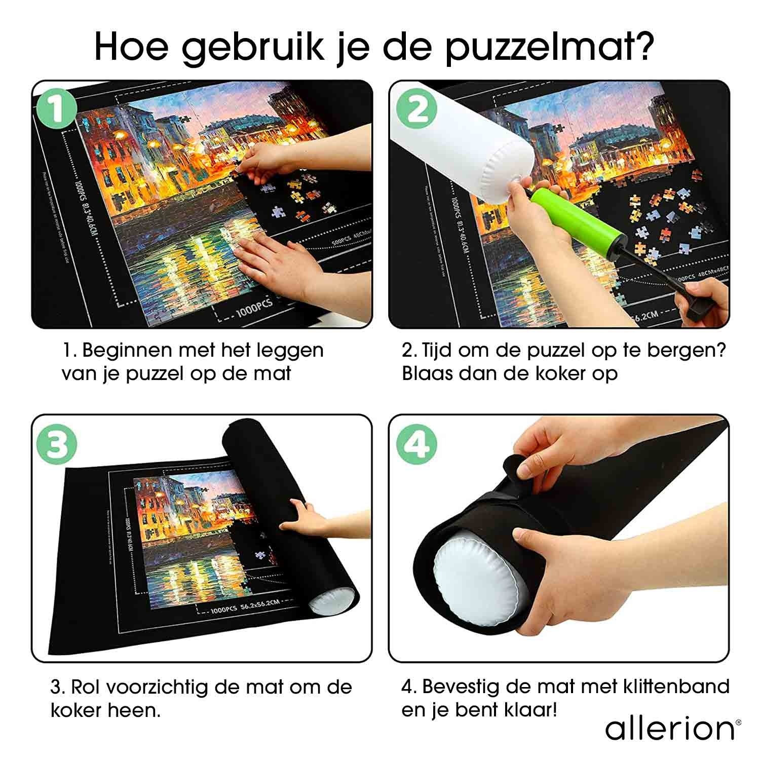 Hou je puzzel intact zonder dat deze kapot gaat! Op de grote puzzelmat kun je puzzels tot wel 1500 stukjes kwijt, ideaal dus. Verwijder alle losse stukjes van het puzzelkleed. Blaas de rol op met het bijgeleverde pompje (of met je mond) en leg deze op het uiteinde van de puzzelmat. Rol de puzzel voorzichtig op, strak tegen de rol aan. Hou de rol bij elkaar met de bijgeleverde bandjes, en plaats het geheel in de opbergtas. Makkelijker wordt het niet!