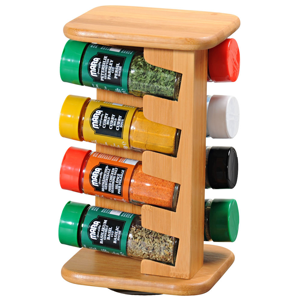 Kesper Roterend Kruidenrek met 8 Gevulde glazen kruiden potjes - Kruidenpotjes Kruidenorganizer - FSC® Bamboe Hout - Afm. 15 x 13 x 25.5 Cm.