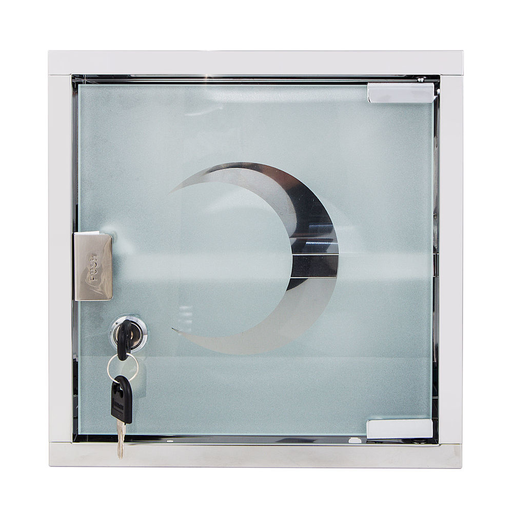 ✅ RVS hangende Medicijnkastje met Slot & Magnetische deur. Met deze medicijnkast zorgt u ervoor dat al uw medicijnen, pillen,etc. overzichtelijk en veilig opgeborgen zijn. En dus niet voor kinderen toegankelijk zijn. De medicijnkast is van (Rvs) roestvrij edelstaal en heeft 2 leg planken. De deur is van melkglas met een halve maan motief van helder glas.