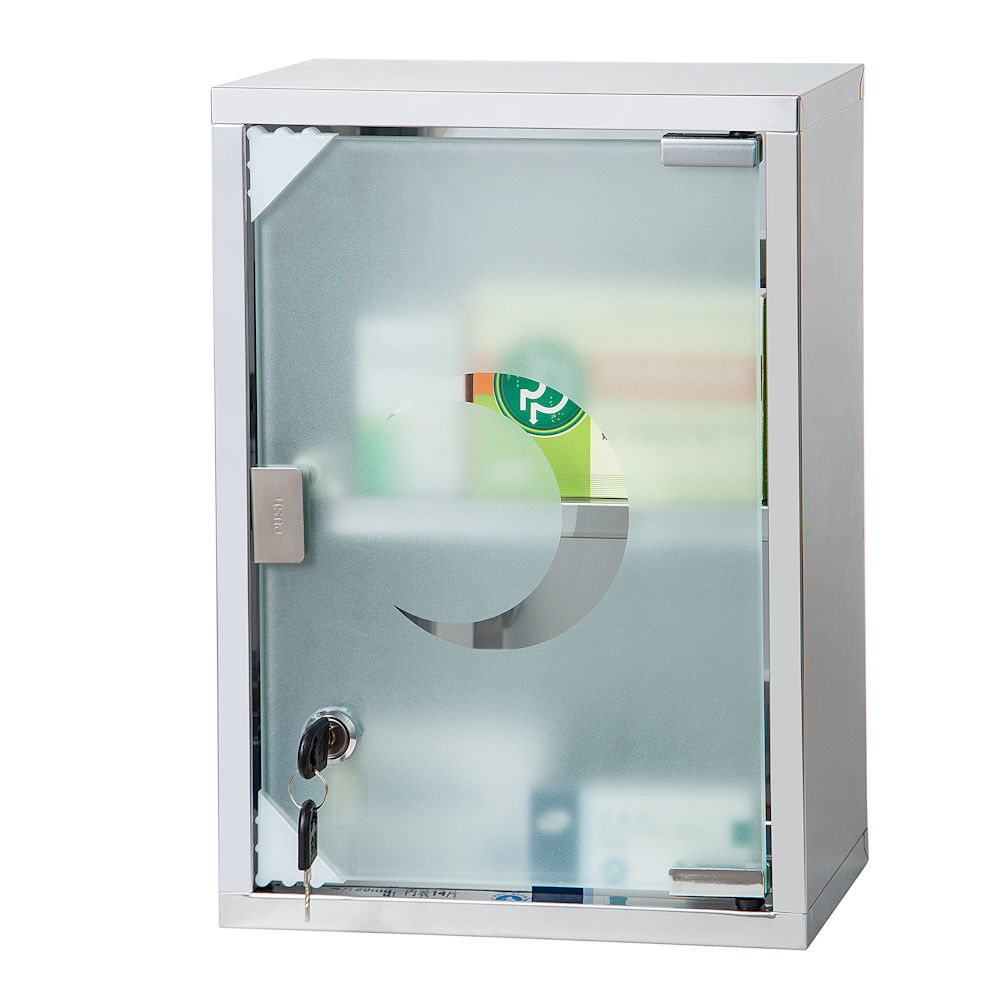✅ RVS hangende Medicijnkastje met Slot & Magnetische deur. Met deze medicijnkast zorgt u ervoor dat al uw medicijnen, pillen,etc. overzichtelijk en veilig opgeborgen zijn. En dus niet voor kinderen toegankelijk zijn. De medicijnkast is van (Rvs) roestvrij edelstaal en heeft 2 leg planken. De deur is van melkglas met een halve maan motief van helder glas.