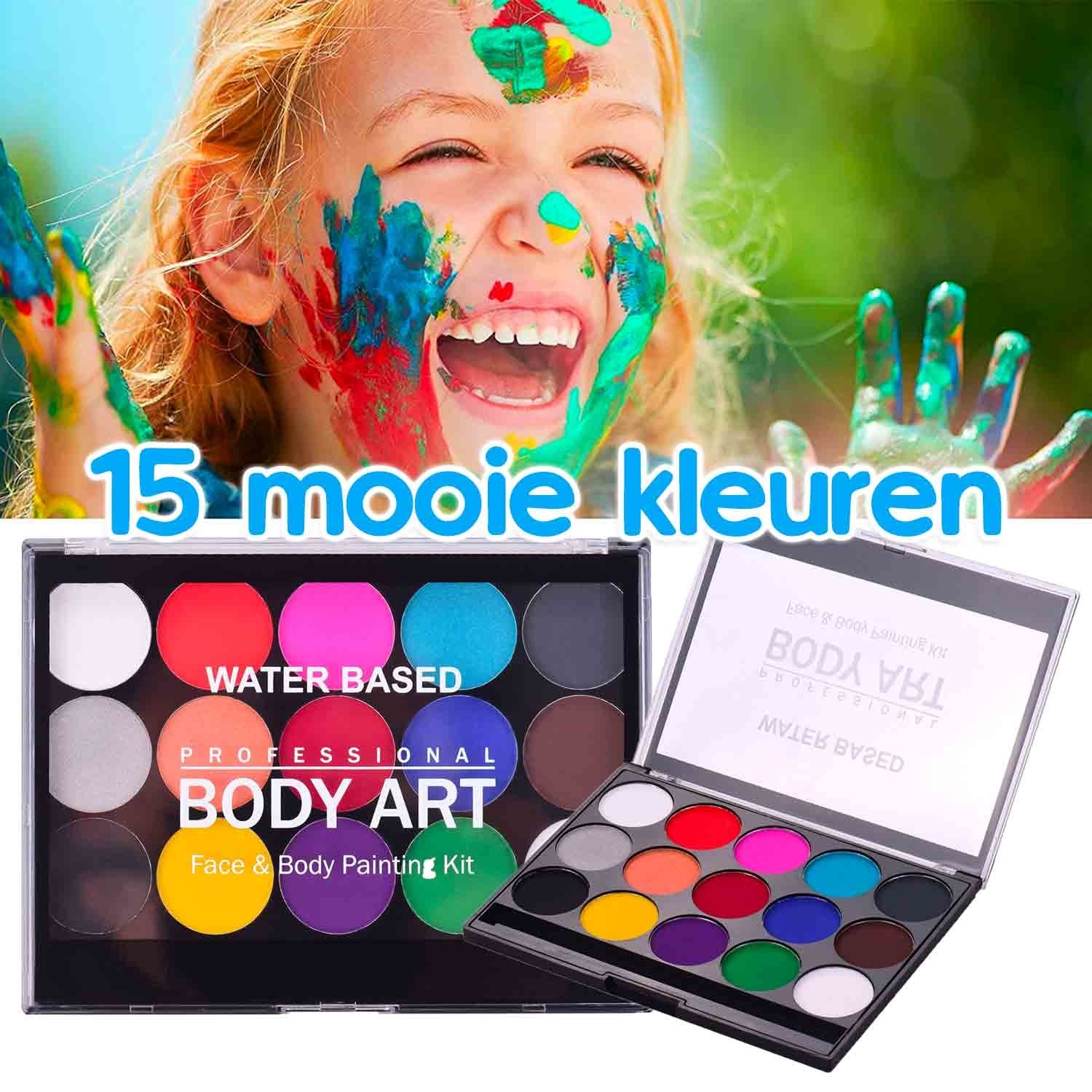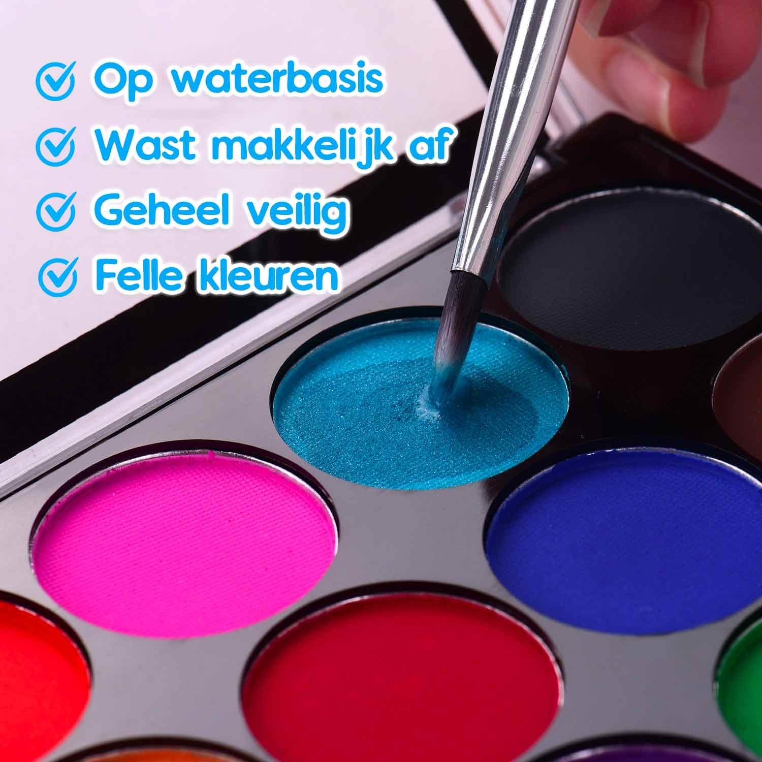 De schminkset bevat schmink op waterbasis. Dit maakt het erg makkelijk om dit aan te brengen, maar ook om te verwijderen. Met water kan de verf zo van het gezicht worden gehaald. De schmink is natuurlijk niet giftig en zal geen schade toebrengen aan de huid. Veelvuldig testen heeft voor de beste samenstelling gezorgd, met deze set kun je schilderen wat je wilt!