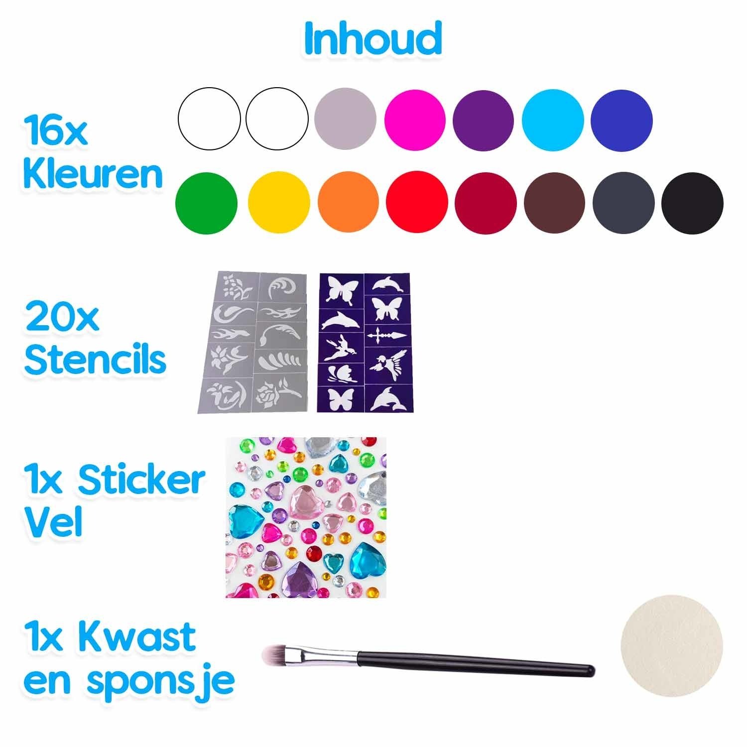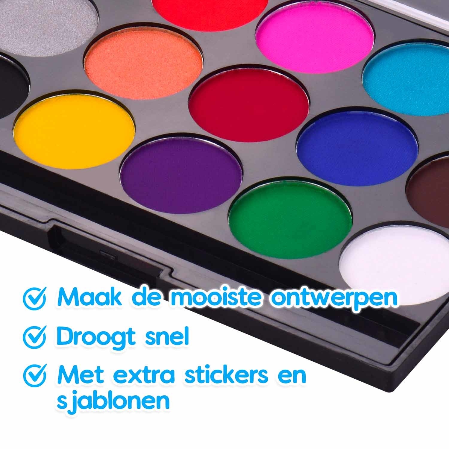 Met maar liefst 15 verschillende kleuren schmink kun jij alles maken dat je wilt! De schmink zit in een praktisch plastic doosje, waardoor je het overal mee naartoe kunt nemen. Ook is hier plaats voor de twee bijgeleverde penseeltjes, sponsje en de stencils. Ga direct aan de slag, alles wat je nodig hebt zit in deze set! Met de stencils maak jij van elk geschminkt gezicht een kunstwerkje! Voor de mooiste prinsessen, dieren en wat je maar kunt bedenken!