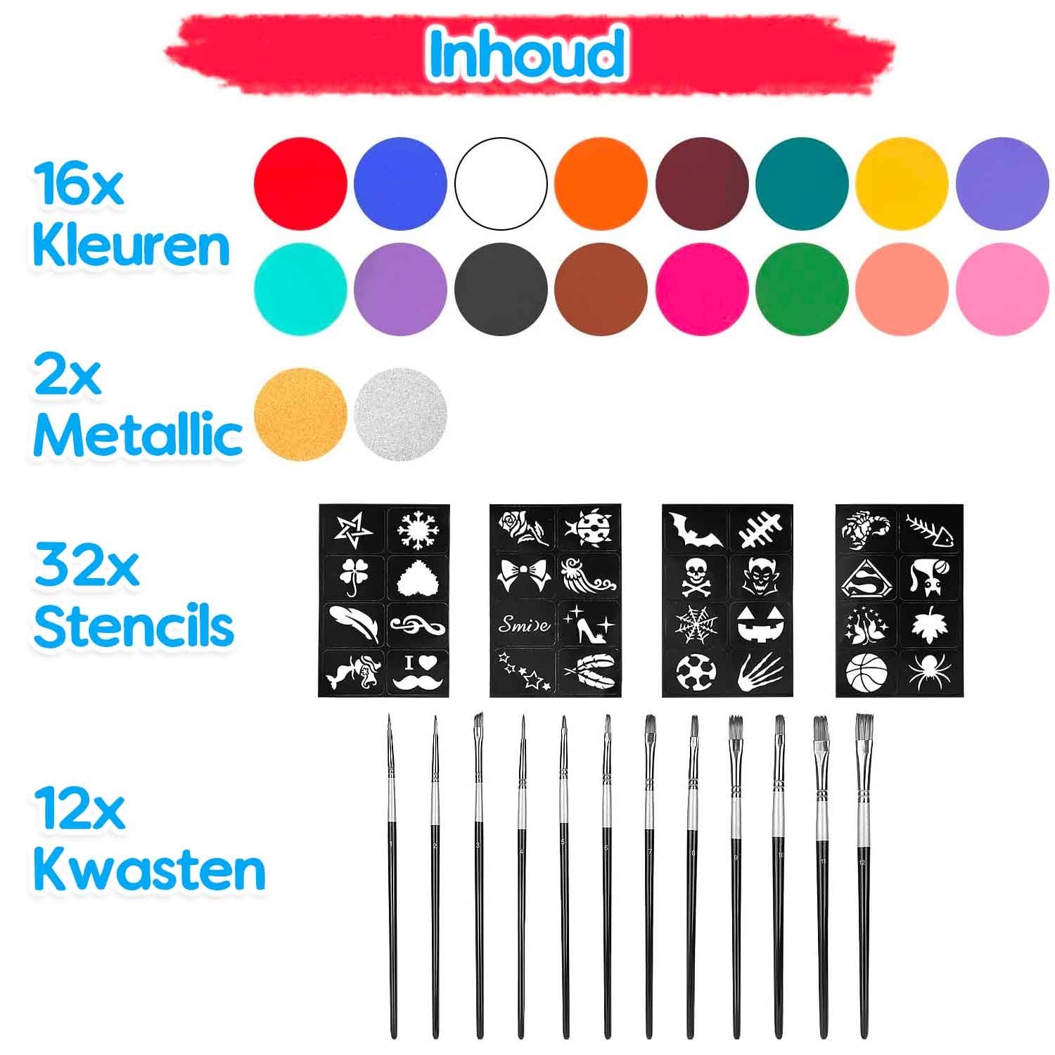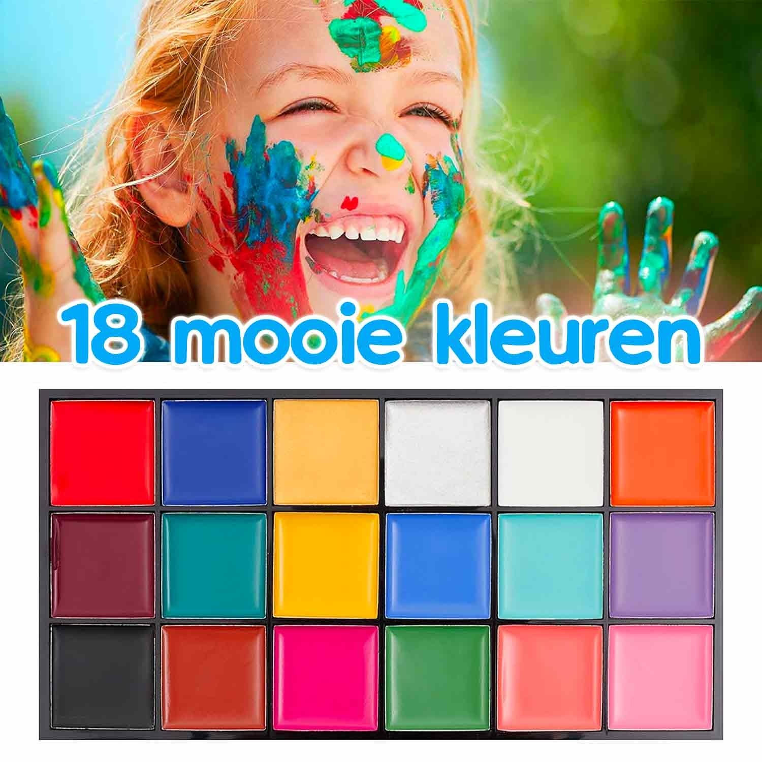 Upgrade elk feestje met een prachtige schmink! Perfect voor Halloween of Carnaval, of verjaardagen en andere momenten. Met maar liefst 18 verschillende kleuren kun jij schilderen wat je maar wilt! Inclusief vele accessoires en stencils. Als wat wil jij geschminkt worden?!