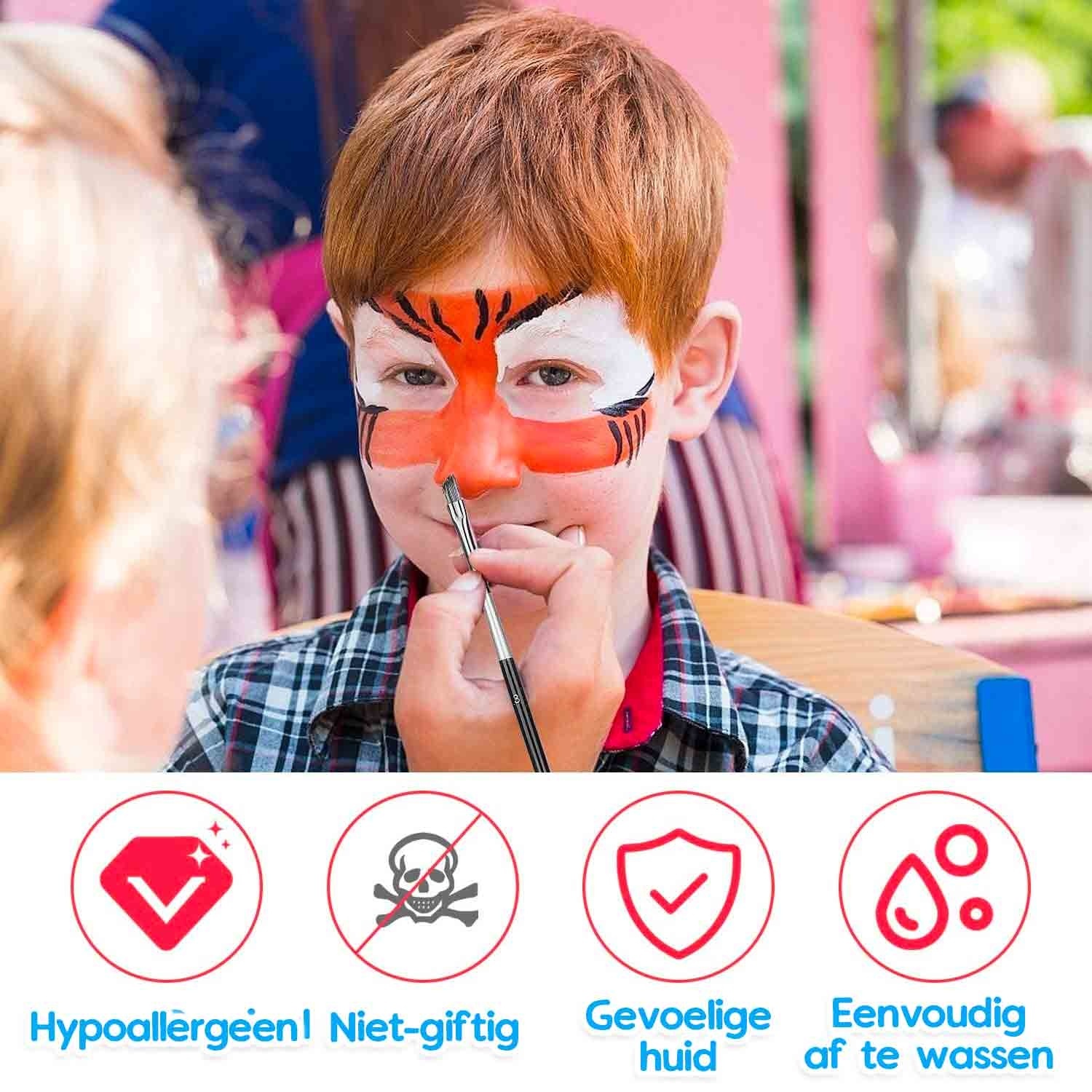 De schminkset bevat schmink op olie basis. Dit is van betere kwaliteit dan schmink op waterbasis. Het blijft daarom ook beter zitten. Met water en zeep of make-up remover kan de verf van het gezicht worden gehaald. De schmink is natuurlijk niet giftig en zal geen schade toebrengen aan de huid. Veelvuldig testen heeft voor de beste samenstelling gezorgd, met deze set kun je schilderen wat je wilt!
