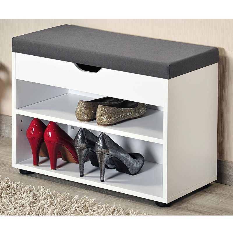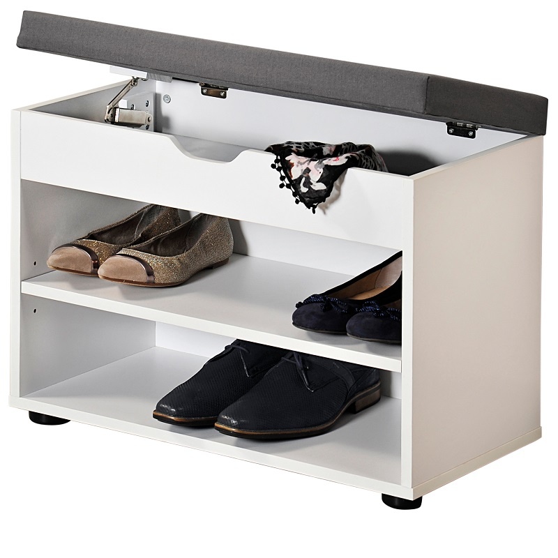 Deze praktische schoenenbank is gemaakt van FSC-gecertificeerd spaanplaat in de kleur wit. De schoenenkast heeft een gevoerde zitbank die kan worden opgetild. Onder de bank is een extra opslagruimte die kan worden gebruikt om sjaals, sjaals, hoeden en and