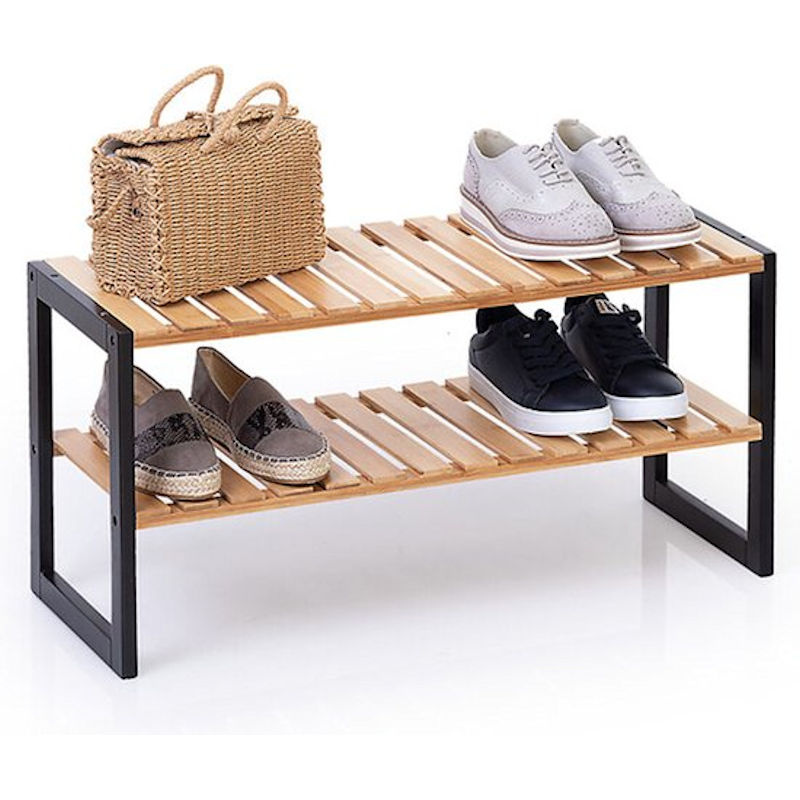 Het schoenenrek heeft zwarte pootjes gemaakt van dennenhout. De twee plankjes waar de schoenen op staan zijn gemaakt van stevig bamboe. Hierdoor is het ook mogelijk om schoenenrekken op elkaar te stapelen zodat je nog meer ruimte krijgt voor het opbergen van je schoenen.