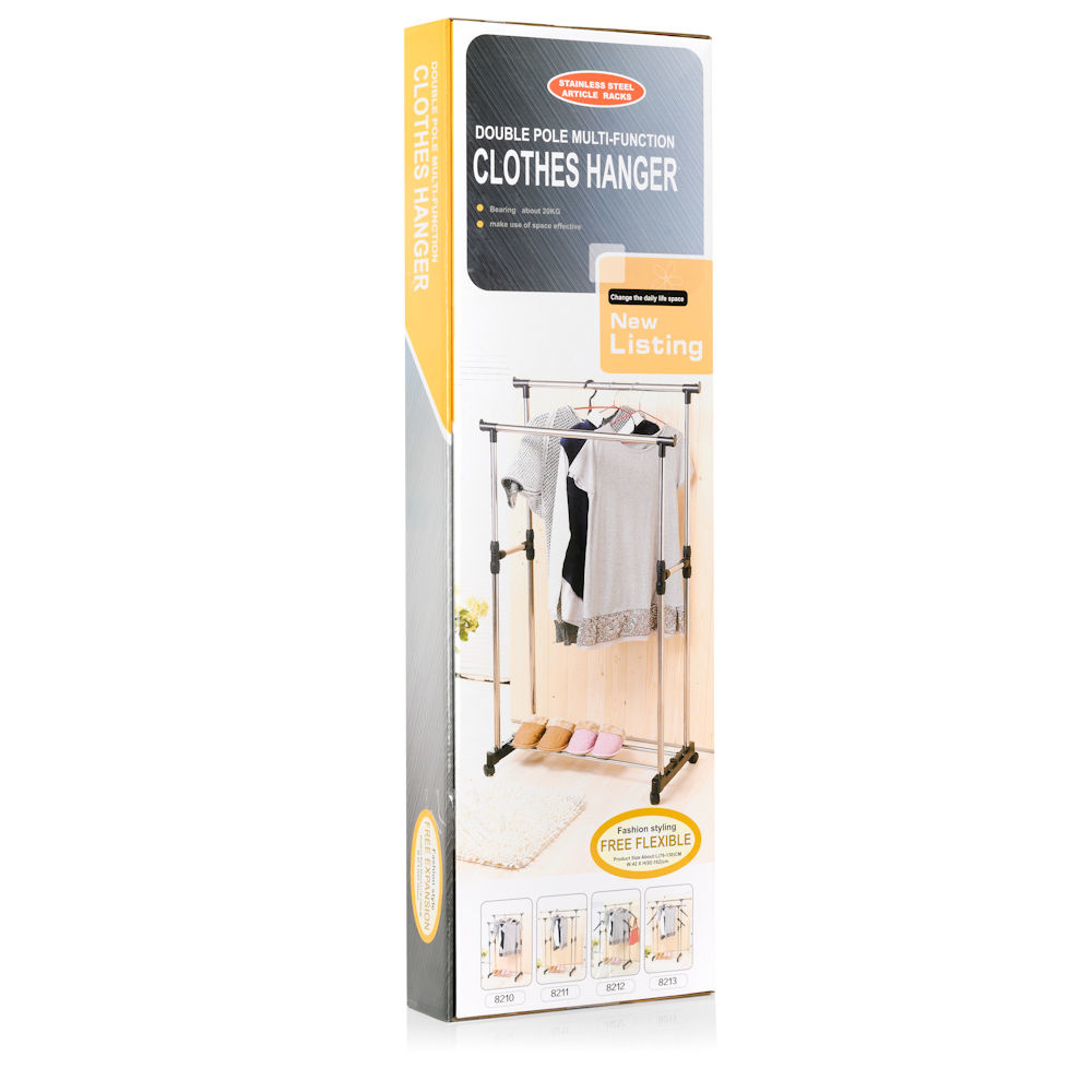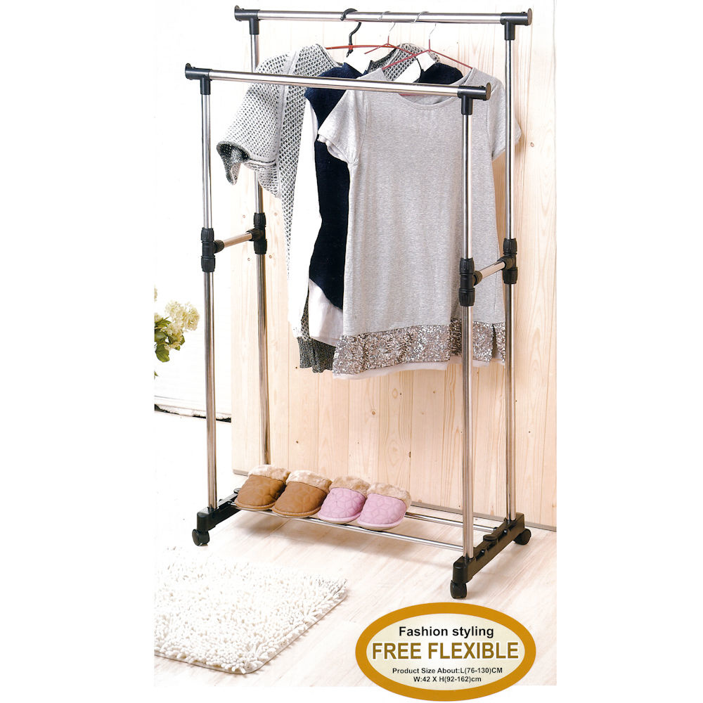 ▶ Praktisch & stevig metalen dubbel kledingrek met wieltjes en verstelbaar in de Hoogte. Op de onderste dwarsbalken van dit kledingrek bevindt zich een praktische opbergrek, voor bijvoorbeeld: uw schoenen tassen, etc. Een perfect kledingrek om uw kleding op te hangen, in uw bedrijf, winkel, kantoor of thuis.